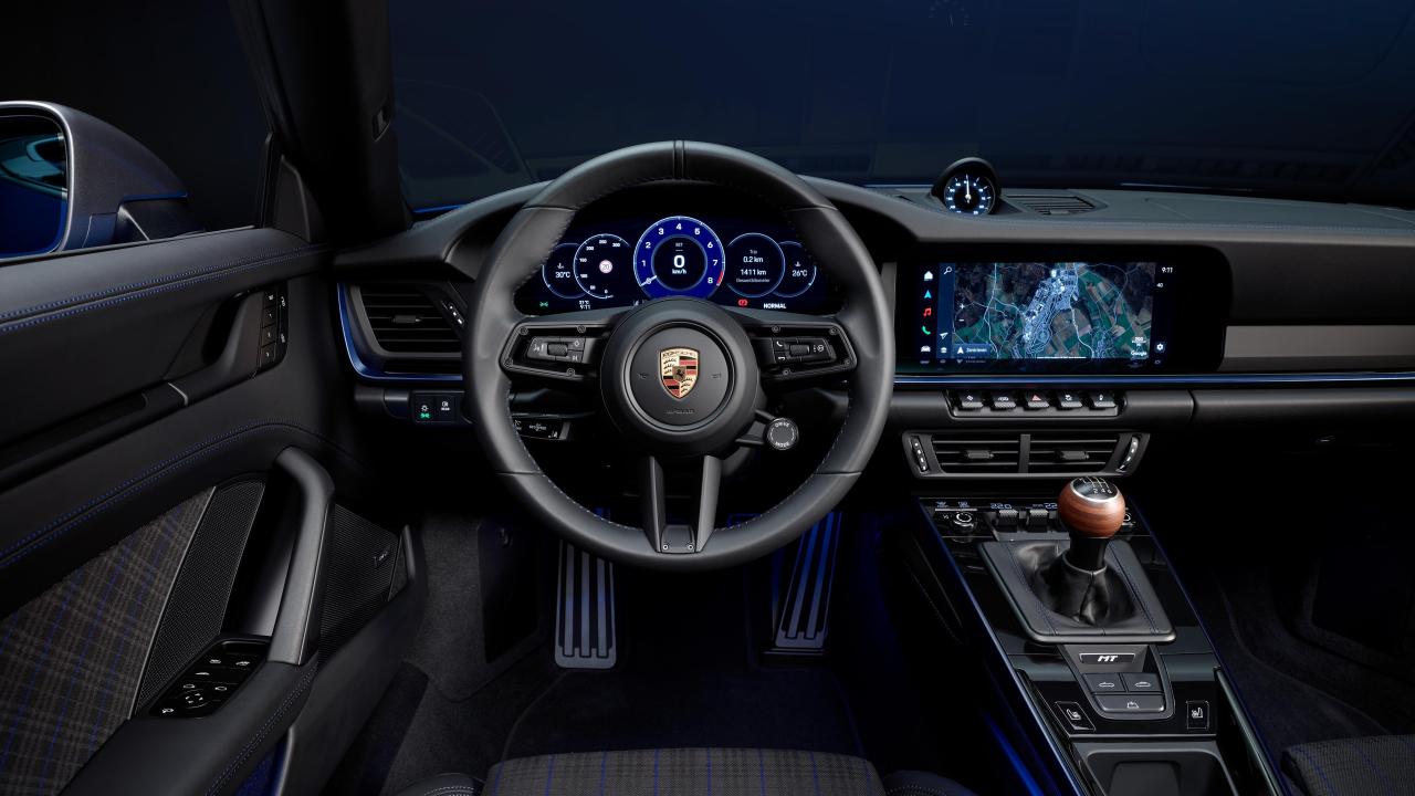 À l'intérieur, l'esprit puriste se prolonge avec des sièges Sport Plus en Sport-Tex Noir de série, des coutures en couleur contrastante, et des finitions exclusives en Gris Vanadium et aluminium brossé noir. La Carrera T propose en option des sièges baquets légers et des sièges Sport Plus adaptatifs à 18 positions, idéaux pour les amateurs de sensations fortes. Un Pack design Carrera T ajoute des touches Bleu Gentiane sur les stickers extérieurs et des coutures intérieures, affirmant son exclusivité.