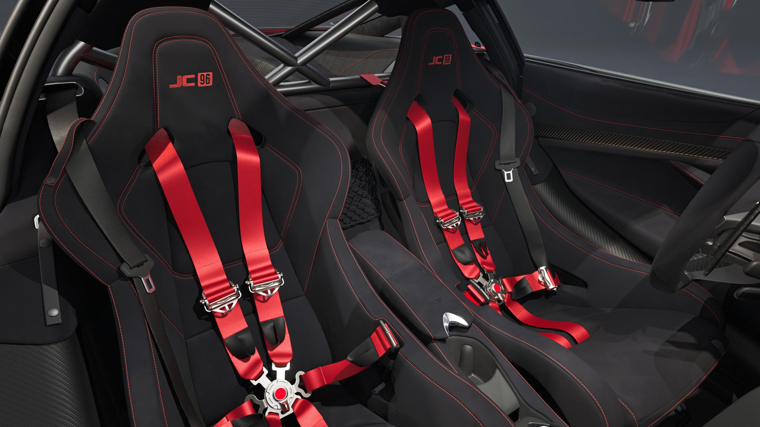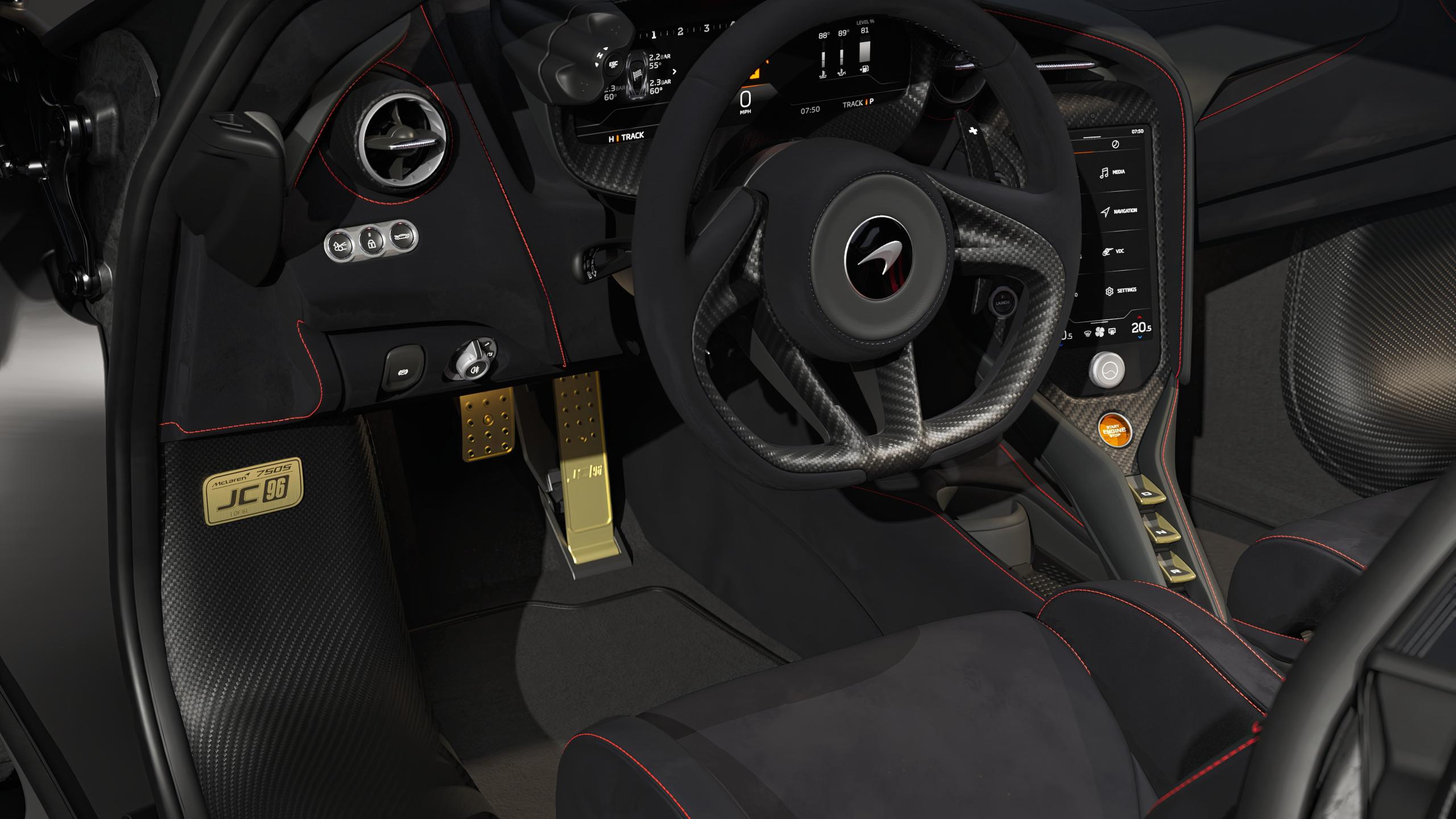 L'habitacle adopte un traitement spécifique avec sellerie Alcantara, éléments en titane sombre brossé et détails dorés sur les pédales, les commandes de sélection de rapport ou encore une plaque commémorative dédiée. Des logos JC96 apparaissent sur les appuie-têtes et accoudoirs, tandis que certains clients pourront opter pour un habillage complet "Tribute Livery", limité à quatre voitures, reprenant intégralement le motif "Tiger Stripe" peint à la main par MSO.