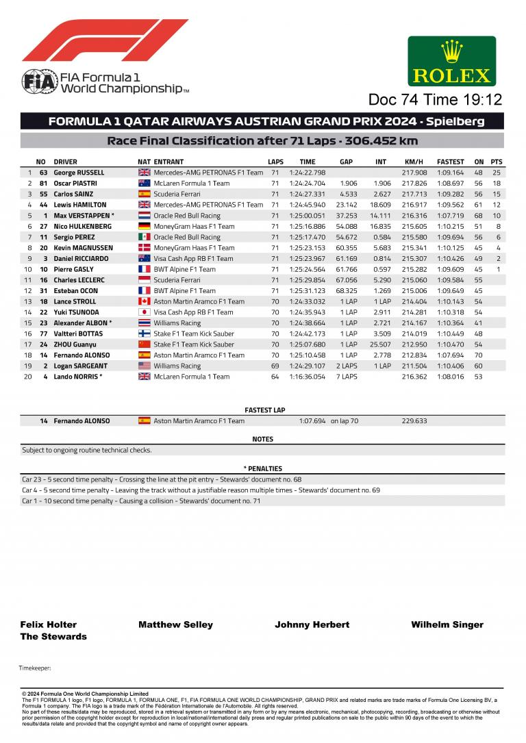 Oscar Piastri a apporté une consolation à McLaren en prenant la deuxième place, suivi de Carlos Sainz sa Ferrari numéro 55 en troisième position. Lewis Hamilton, malgré un écart important, a terminé quatrième avec sa Mercedes, tandis que Verstappen a franchi la ligne en cinquième position sans perdre davantage de positions malgré une pénalité de 10 secondes pour son incident avec Norris.