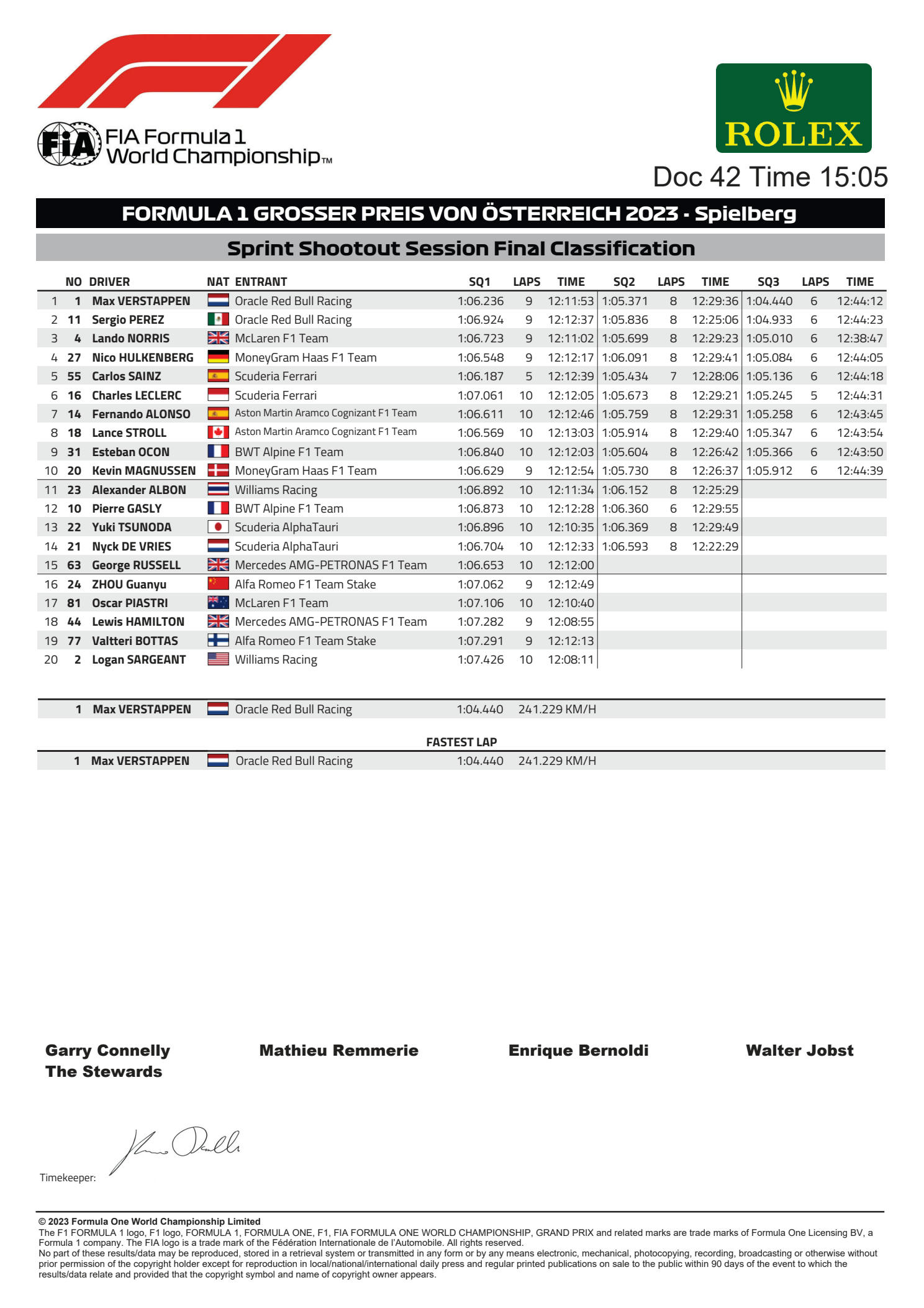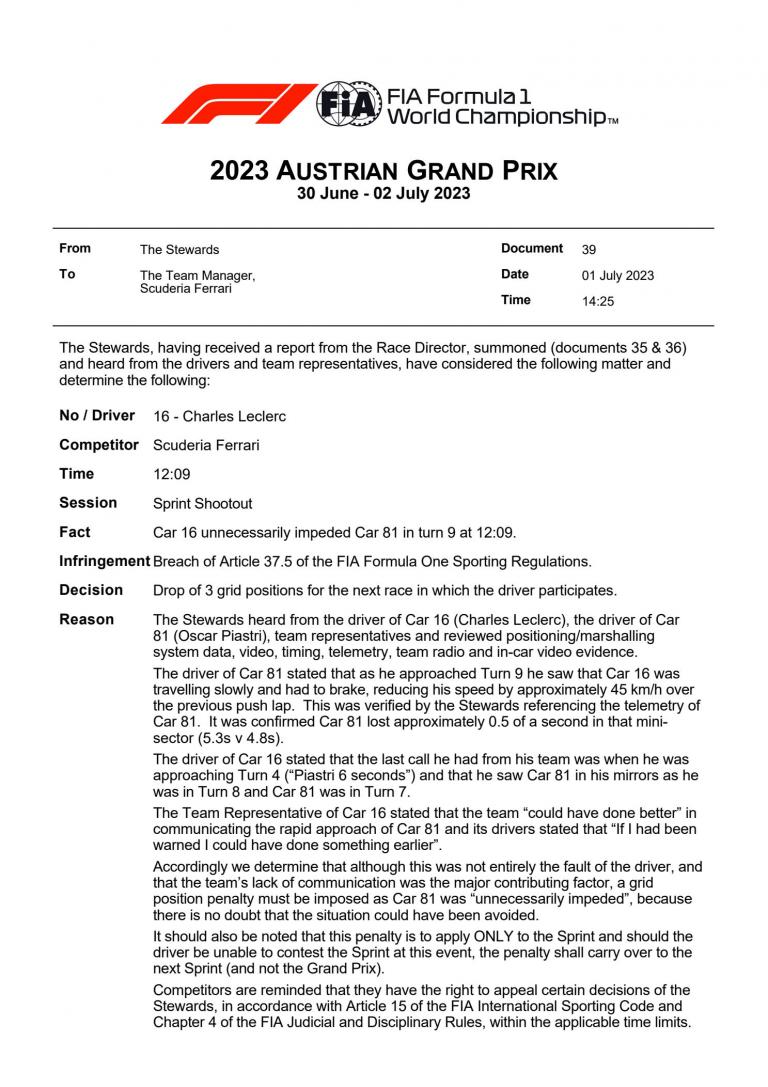 Suite au shootout, une pénalité a vu Charles Leclerc se faire rétrograder sur la grille de départ du sprint de la sixième à la neuvième place, ce qui a promu le duo d'Aston Martin, Fernando Alonso et Lance Stroll, ainsi qu'Esteban Ocon d'Alpine. Le pilote Ferrari ait été reconnu coupable d'avoir gêné le rookie de McLaren, Oscar Piastri, lors de la séance de qualifications.