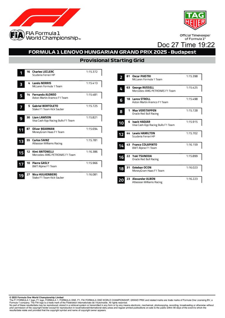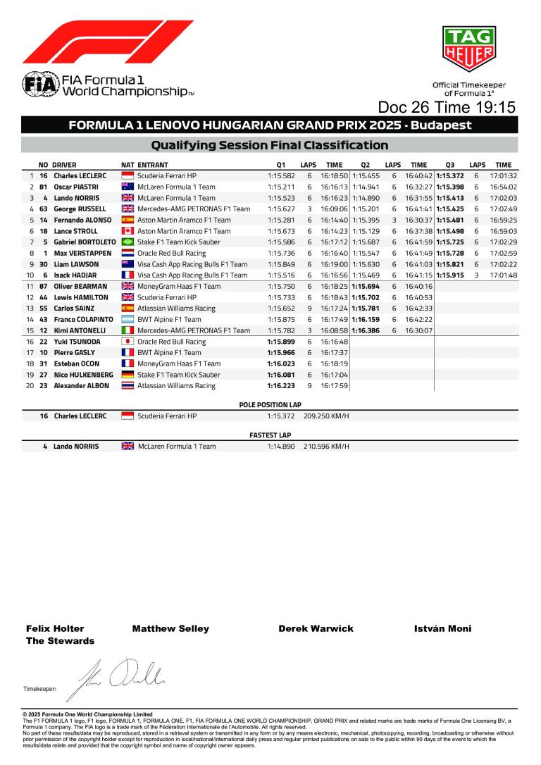 Charles Leclerc a créé la surprise en s'emparant de la pole position du Grand Prix de Hongrie 2025 au terme d'une séance de qualifications tendue et extrêmement serrée. Sur un Hungaroring piégeux, avec un vent renforcé et quelques gouttes de pluie en Q2, le pilote Ferrari a signé un tour décisif en 1:15.372 dans les dernières secondes de Q3 pour devancer Oscar Piastri de 0.026 s et Lando Norris de 0.041 s.