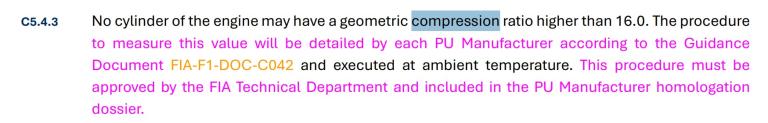 L'article C5.4.3 du règlement technique précise ainsi que "aucun cylindre du moteur ne peut présenter un taux de compression géométrique supérieur à 16.0". Il est également indiqué que "la procédure de mesure de cette valeur est définie par chaque motoriste conformément au document de référence FIA-F1-DOC-C042 et réalisée à température ambiante", cette procédure devant être validée par le département technique de la FIA et intégrée au dossier d'homologation du motoriste.