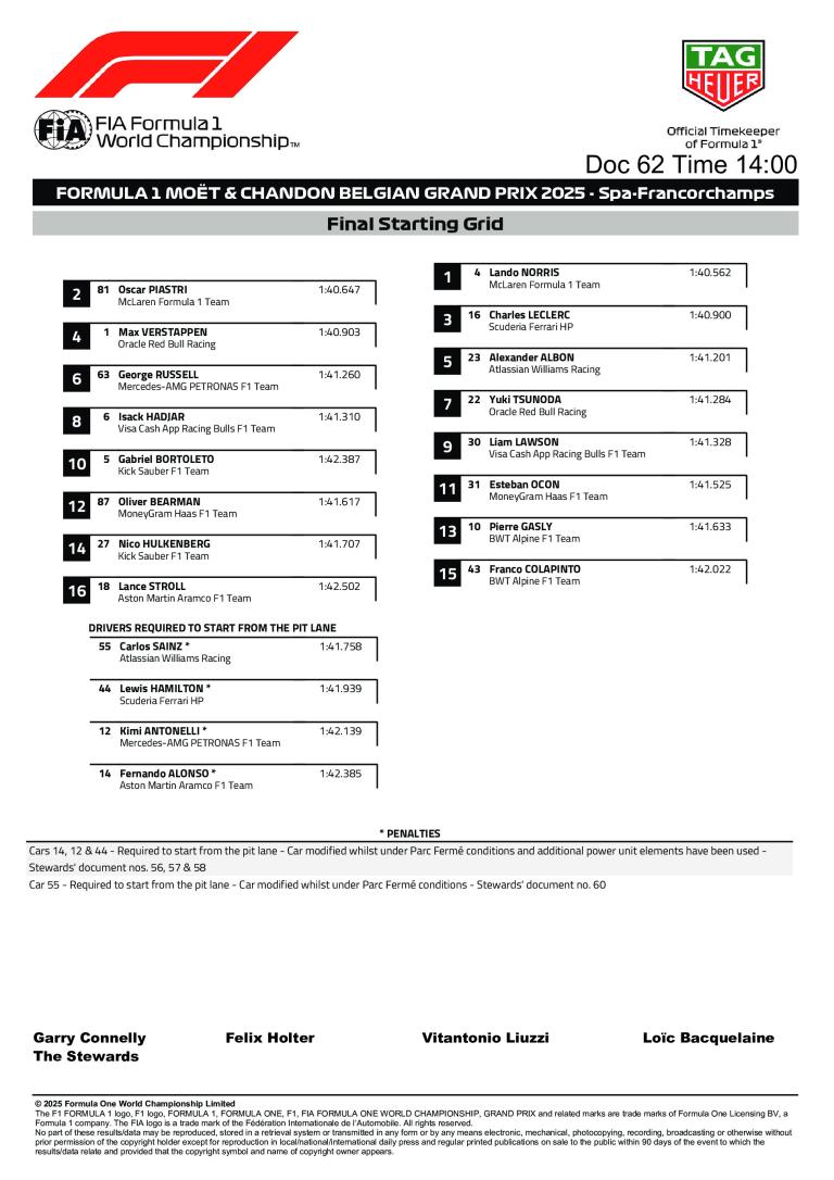 Oscar Piastri a remporté le Grand Prix de Belgique 2025 au terme d'une course à rebondissements marquée par une longue interruption due à la pluie [comprendre que la GP n'a pas débuté avant 16:20 puis a subi 4 tours derrière la voiture de sécurité]. Parti deuxième, l'Australien a pris l'avantage sur Lando Norris dès le premier tour lancé pour ne plus jamais le céder, consolidant son avance au classement pilotes.