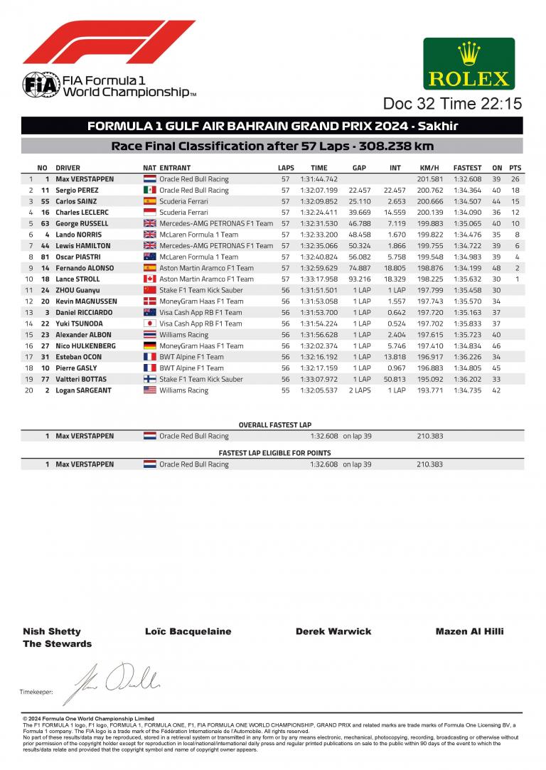 Au cours d'une course dominée de bout en bout, Max Verstappen a confirmé son statut de favori en menant le Grand Prix de Bahreïn 2024 du premier au dernier tour. Le pilote de Red Bull a franchi la ligne d'arrivée avec une avance considérable de 22 secondes sur son coéquipier, Sergio Perez, qui a su remonter de sa modeste position glanée en qualifications pour compléter un doublé Red Bull, illustrant la supériorité de leur stratégie et de leur gestion de course.