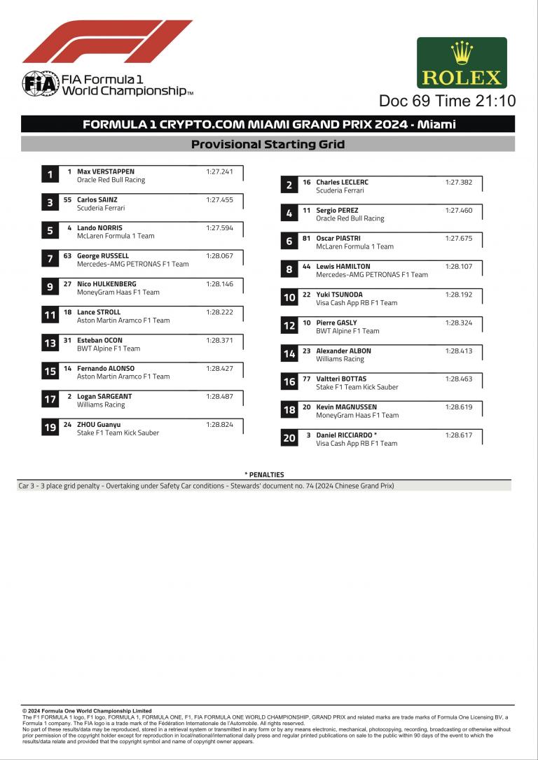 La quatrième ligne est occupée par les Mercedes de George Russell et Lewis Hamilton, classés septième et huitième. Nico Hülkenberg, au volant de sa Haas, a réitéré sa bonne performance de la Chine en se classant neuvième, et Yuki Tsunoda de l'équipe VCARB a vaillamment complété le top 10.