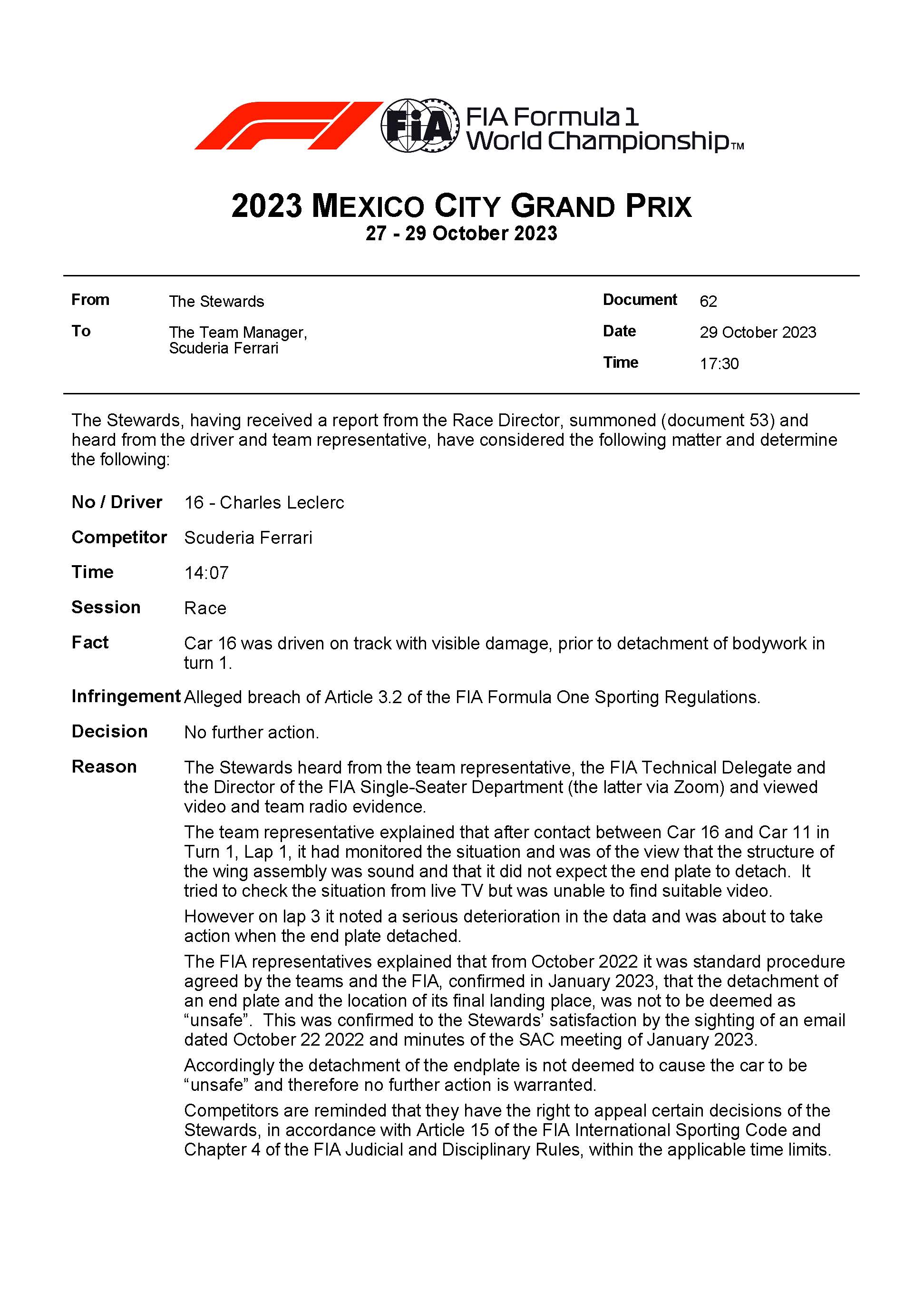 Pas d'action contre Leclerc pour avoir piloté "avec des dommages visibles avant que des parties de la carrosserie [flap vertical gauche de l'aileron avant] ne se détachent au virage 1".