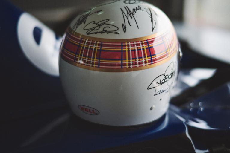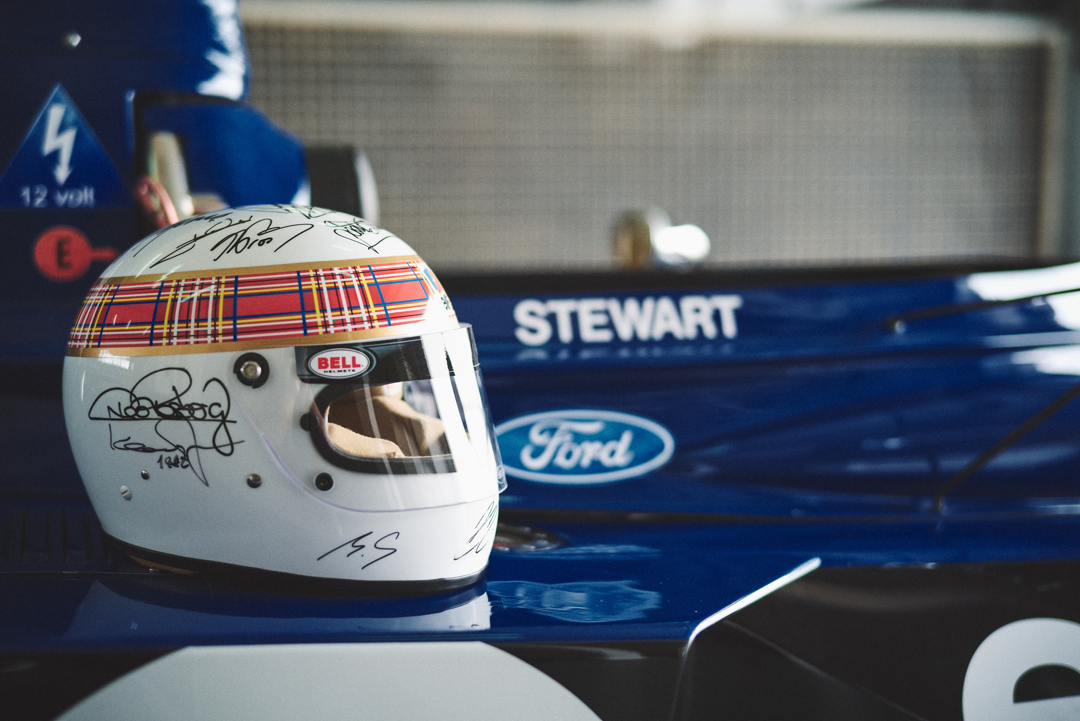Pour cette apparition exceptionnelle, Stewart portait un casque qui l'est tout autant : un modèle Bell décoré du traditionnel tartan écossais qui a marqué son identité visuelle tout au long de sa carrière, et signé par les 20 champions du monde de F1 encore en vie (Verstappen, Hamilton, Rosberg, Prost et etc.).