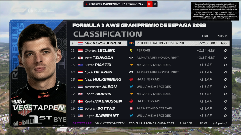 Victoire de Max Verstappen devant Lewis Hamilton et George Russell, pour ce GP d’Espagne 2023.