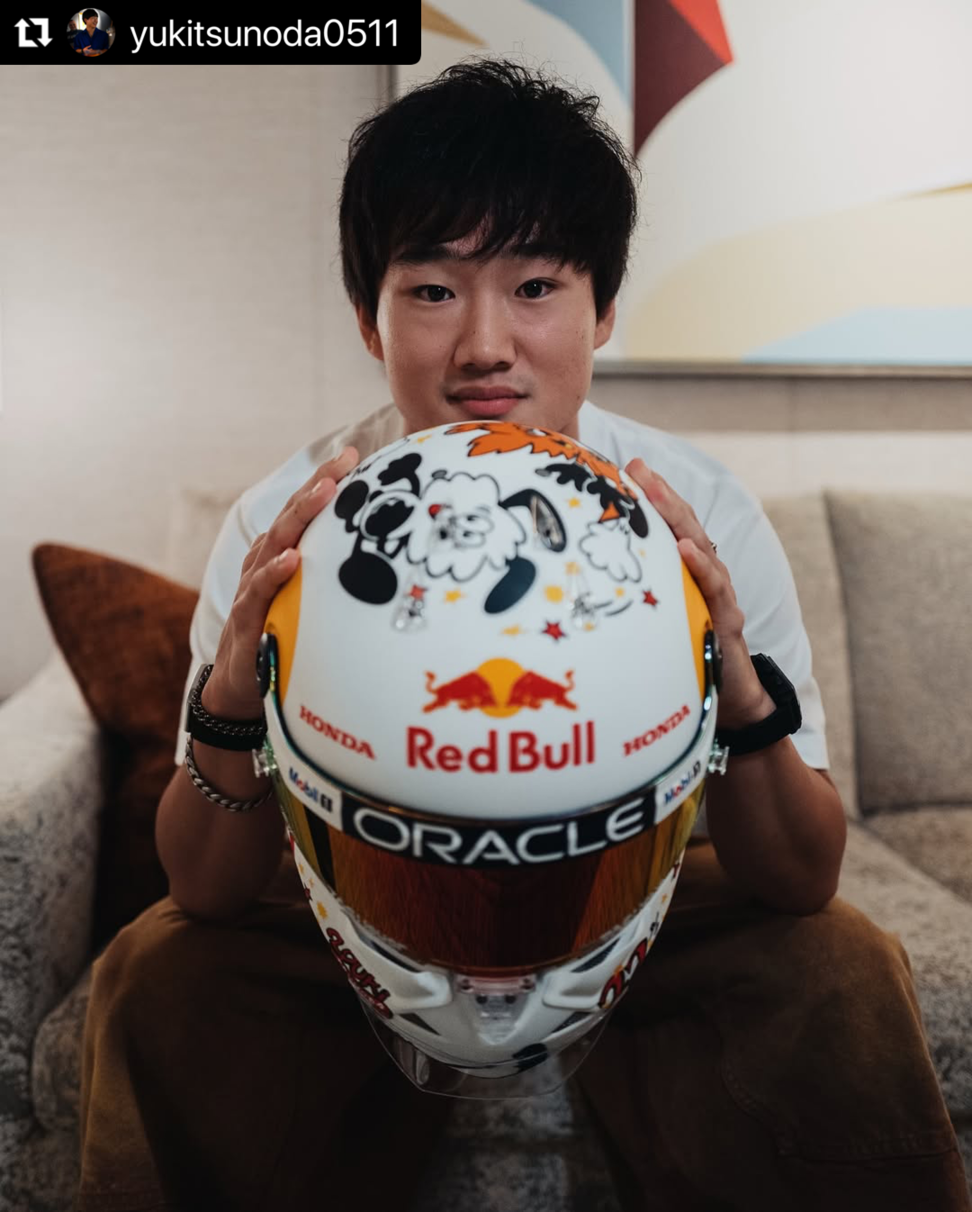 Yuki Tsunoda a lui aussi profité du Grand Prix de Singapour pour présenter un casque inédit. Le pilote japonais arbore cette fois un design blanc et orange agrémenté de nombreux personnages illustrés dans un style cartoon.
