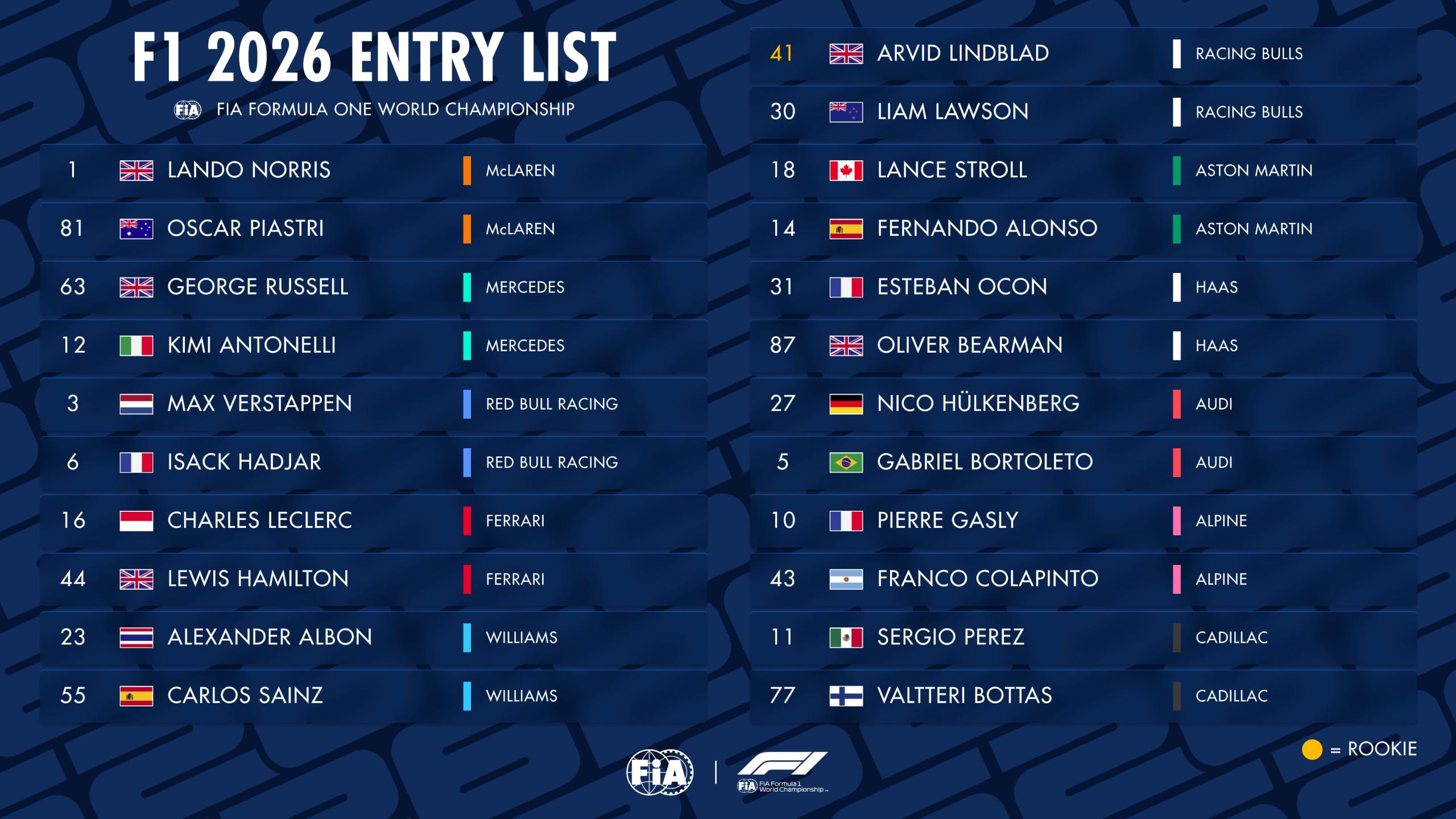 La liste des engagés pour la saison 2026 de Formule 1 confirme une grille particulièrement stable, avec un seul véritable nouveau venu : Arvid Lindblad. Le Britannique est l'unique rookie de ce plateau et fera ses débuts chez Racing Bulls avec le numéro 41, ce qui tranche avec l'an dernier marqué par un arrivage massif de jeunes pilotes.