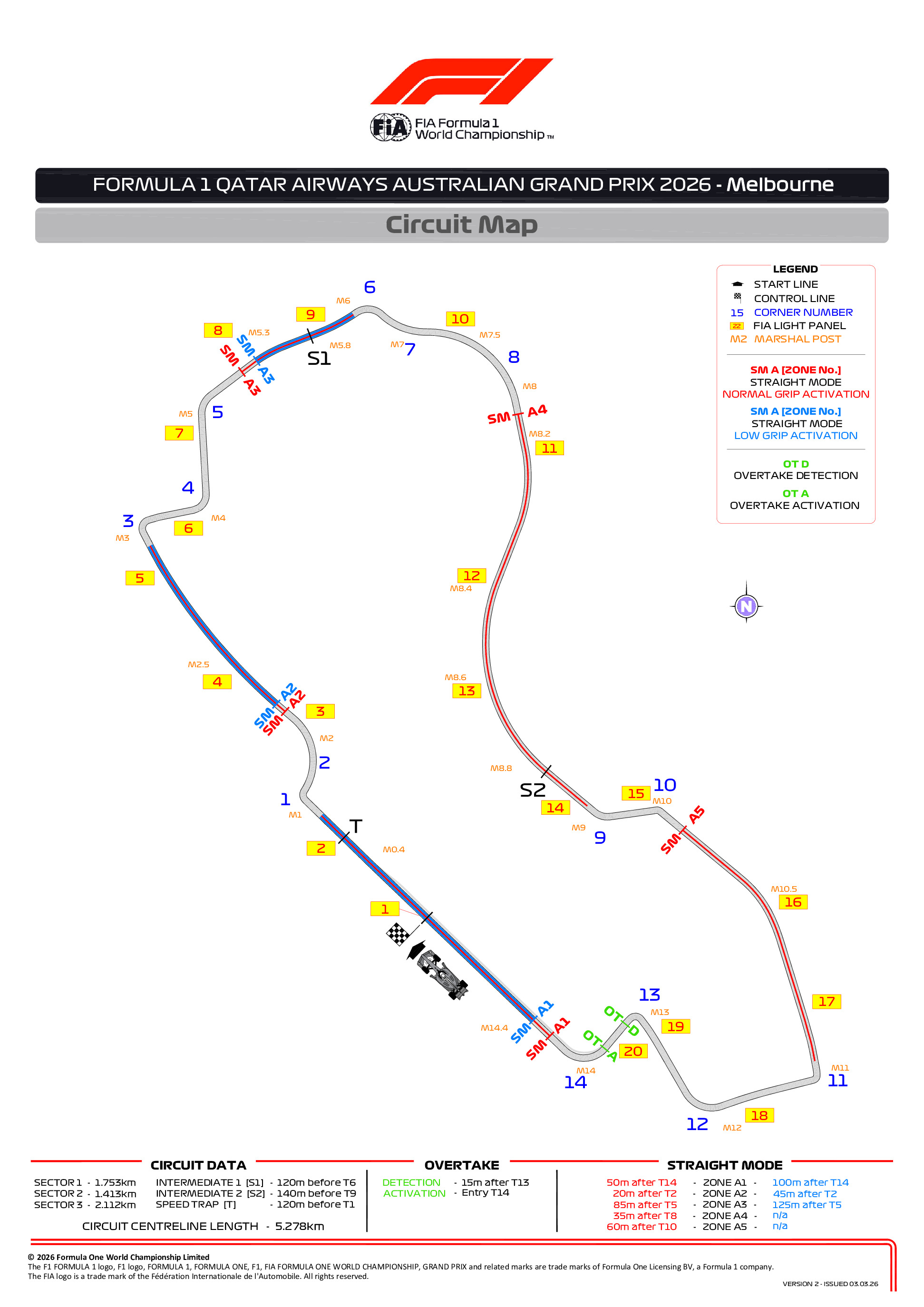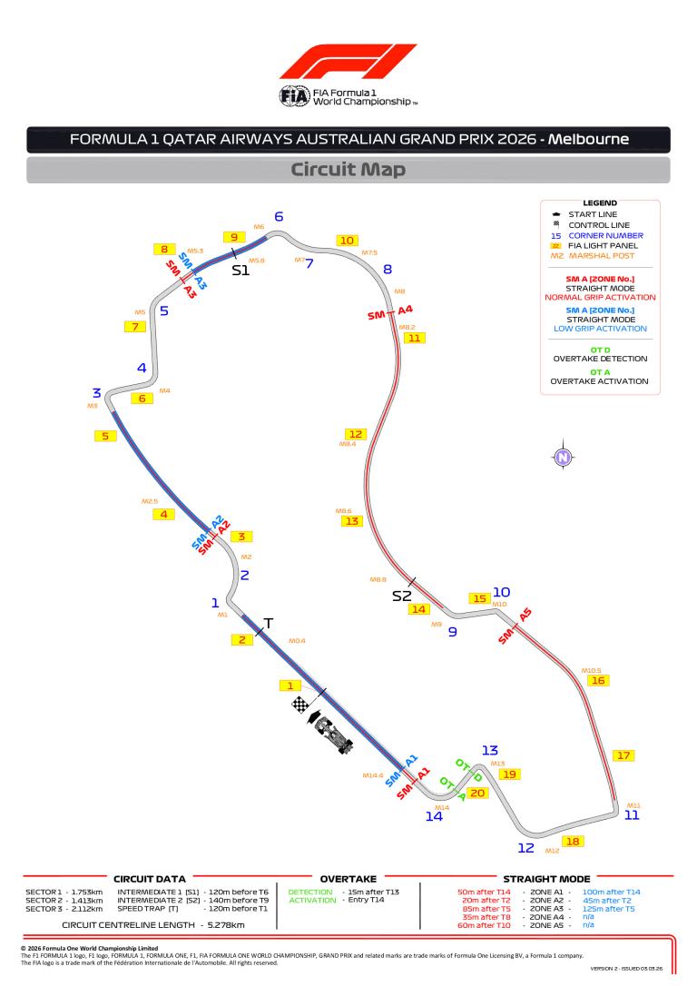 Retour aux Brefs F1Pour le Grand Prix d'Australie 2026, disputé sur le circuit semi-urbain d'Albert Park à Melbourne, plusieurs ajustements ont été apportés au tracé, tandis que la FIA introduit pour la première fois l'utilisation des zones de "Straight Mode" (mode ligne droite) liées aux nouvelles aérodynamiques actives des monoplaces.