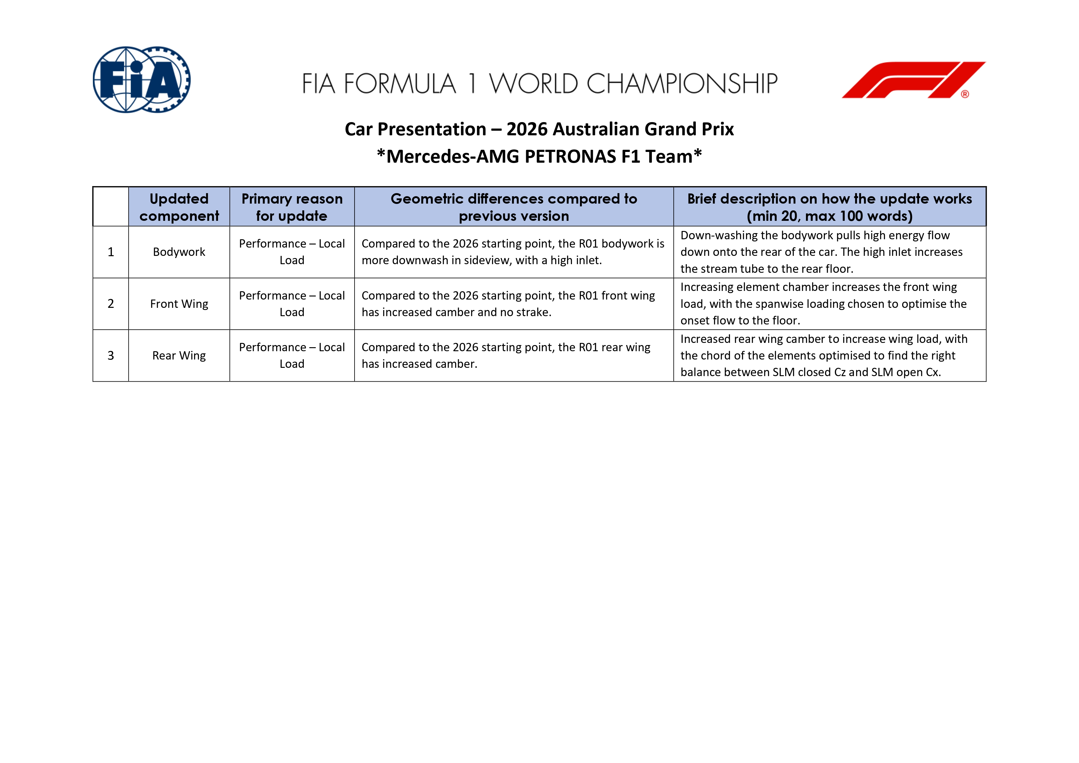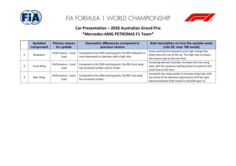 Retour aux Brefs F1Mercedes introduit trois évolutions sur la W17 pour la manche d'ouverture de la saison 2026 à Melbourne, portant sur la carrosserie, l'aileron avant et l'aileron arrière. L'ensemble vise principalement à augmenter la charge aérodynamique et à améliorer la qualité des flux alimentant le plancher.