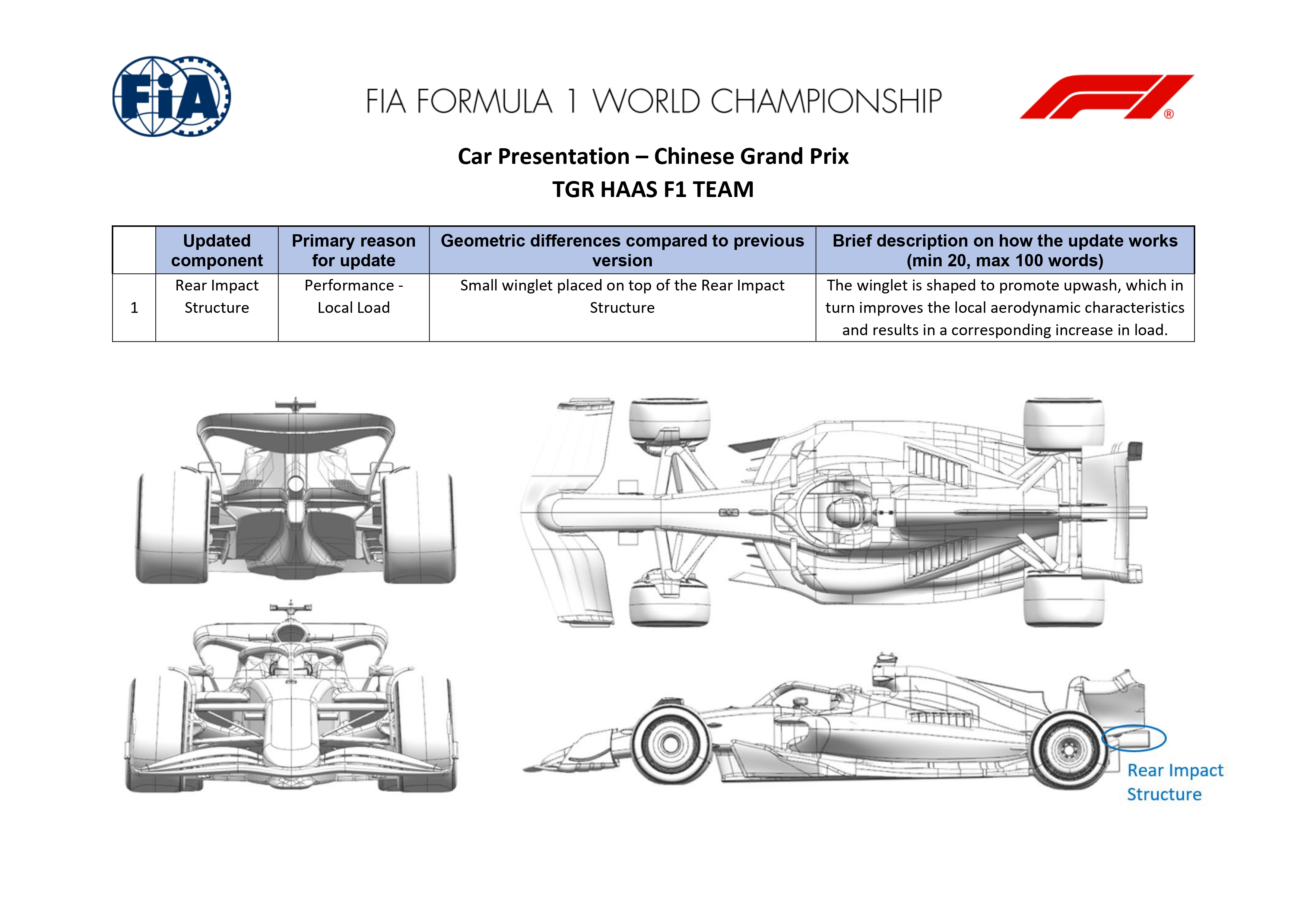 Retour aux Brefs F1Du côté de Haas F1 Team, l'évolution déclarée pour le Grand Prix de Chine 2026 concerne la partie arrière de la Haas VF-26, plus précisément la structure d'impact arrière (rear impact structure).