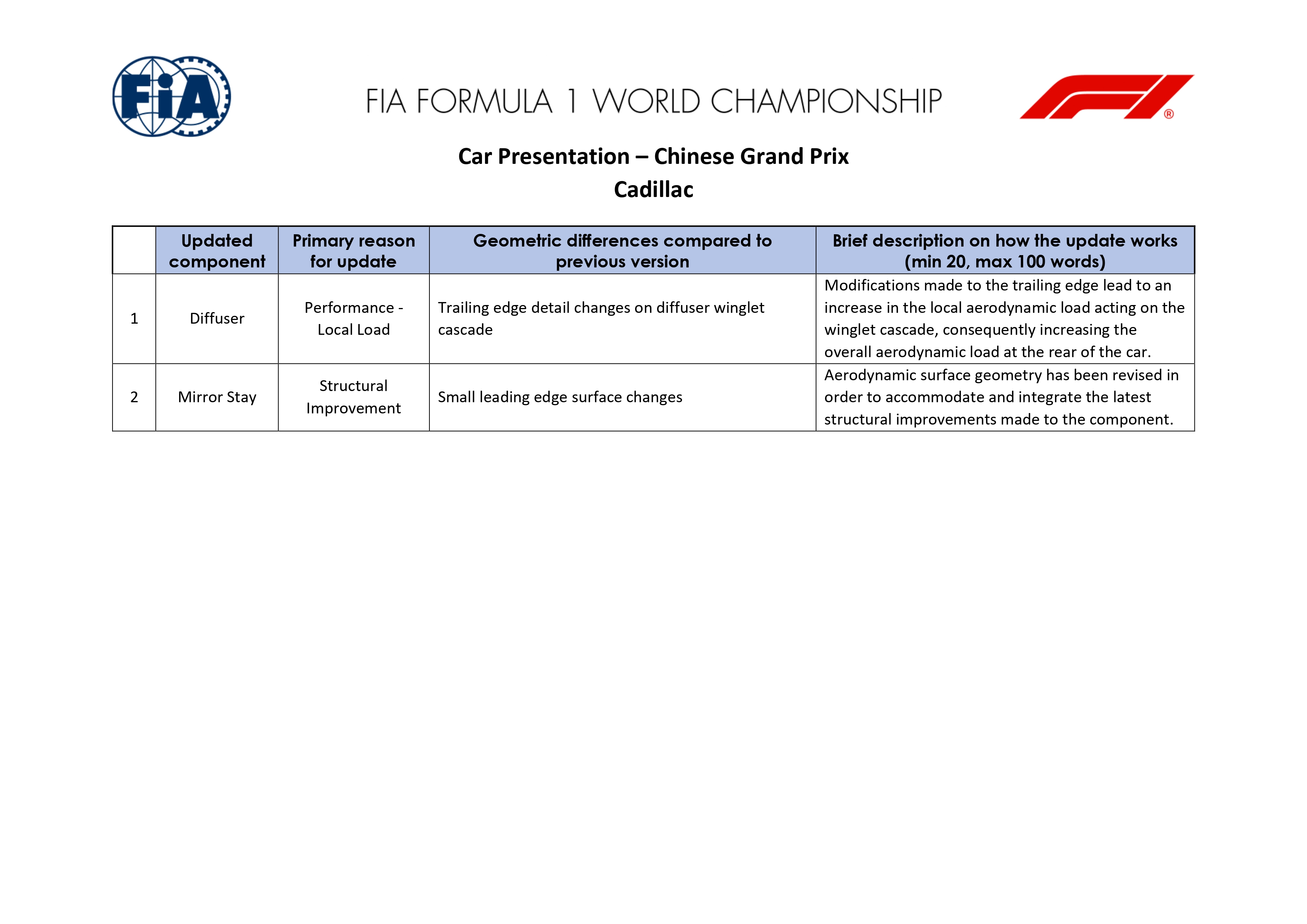 Retour aux Brefs F1Chez Cadillac F1 Team, deux évolutions apparaissent dans la déclaration technique déposée auprès de la FIA pour le Grand Prix de Chine 2026, l'une concernant l'arrière de la Cadillac MAC-26 et l'autre un élément structurel autour des rétroviseurs.