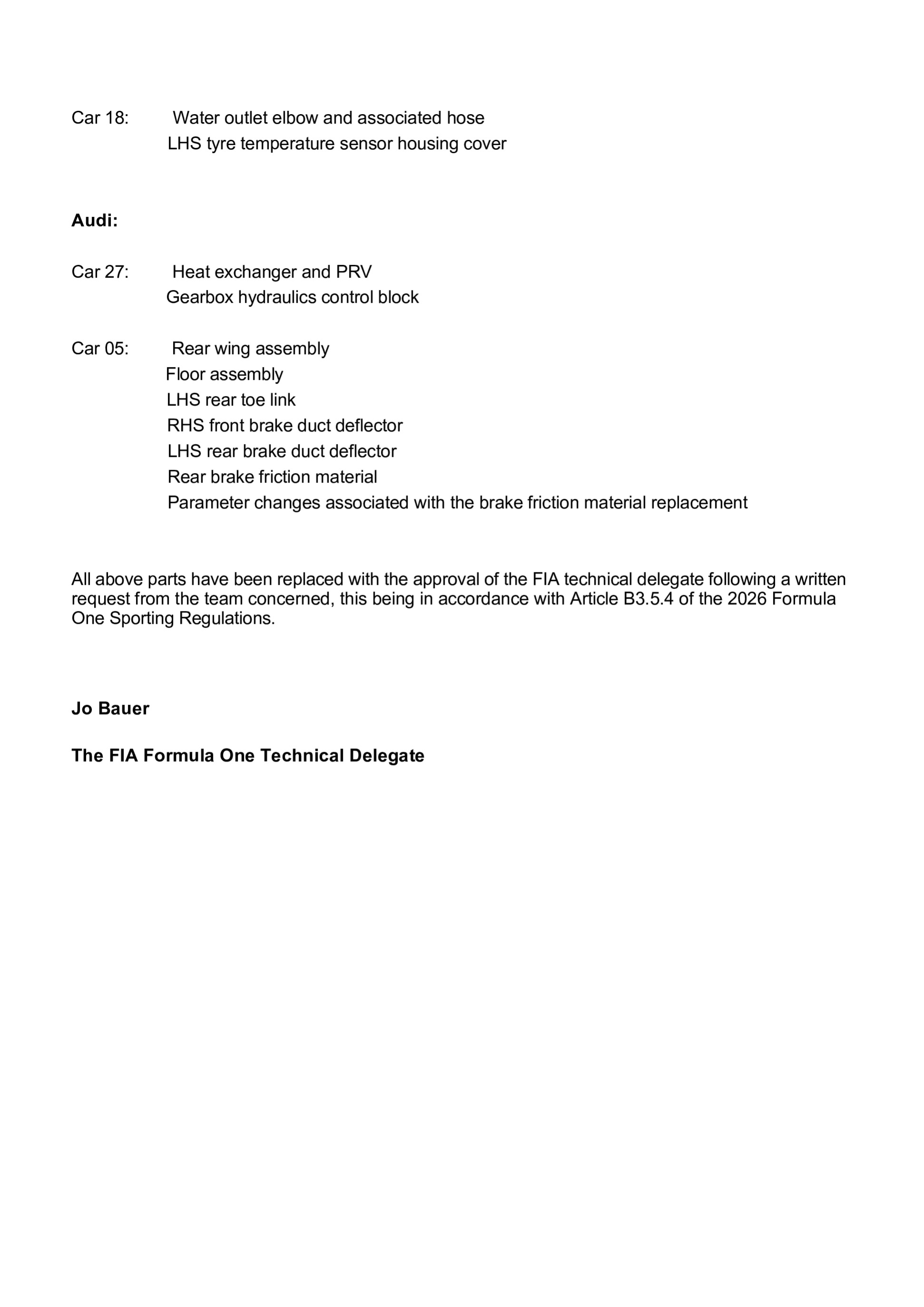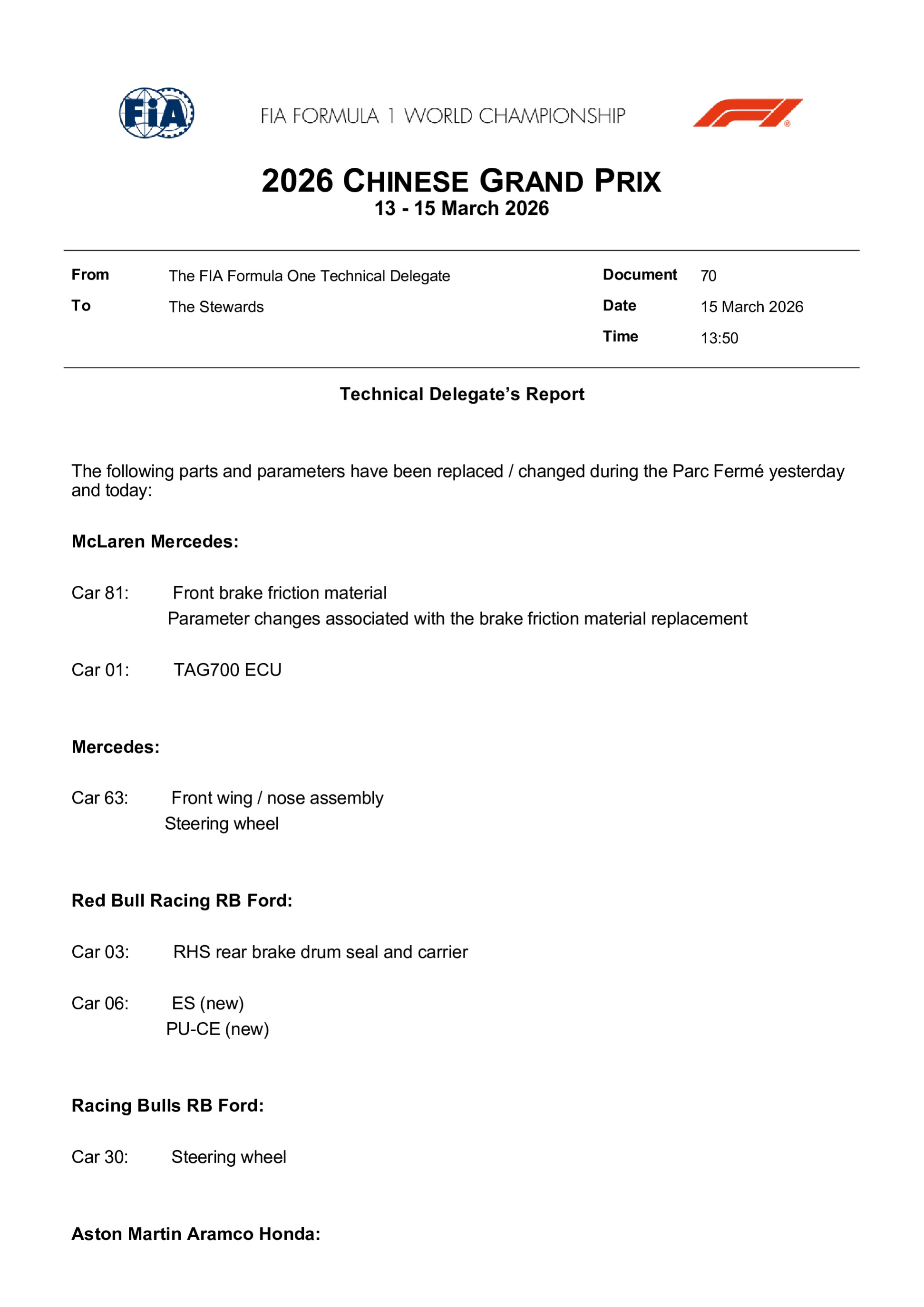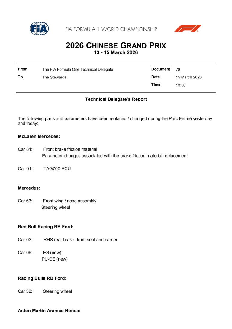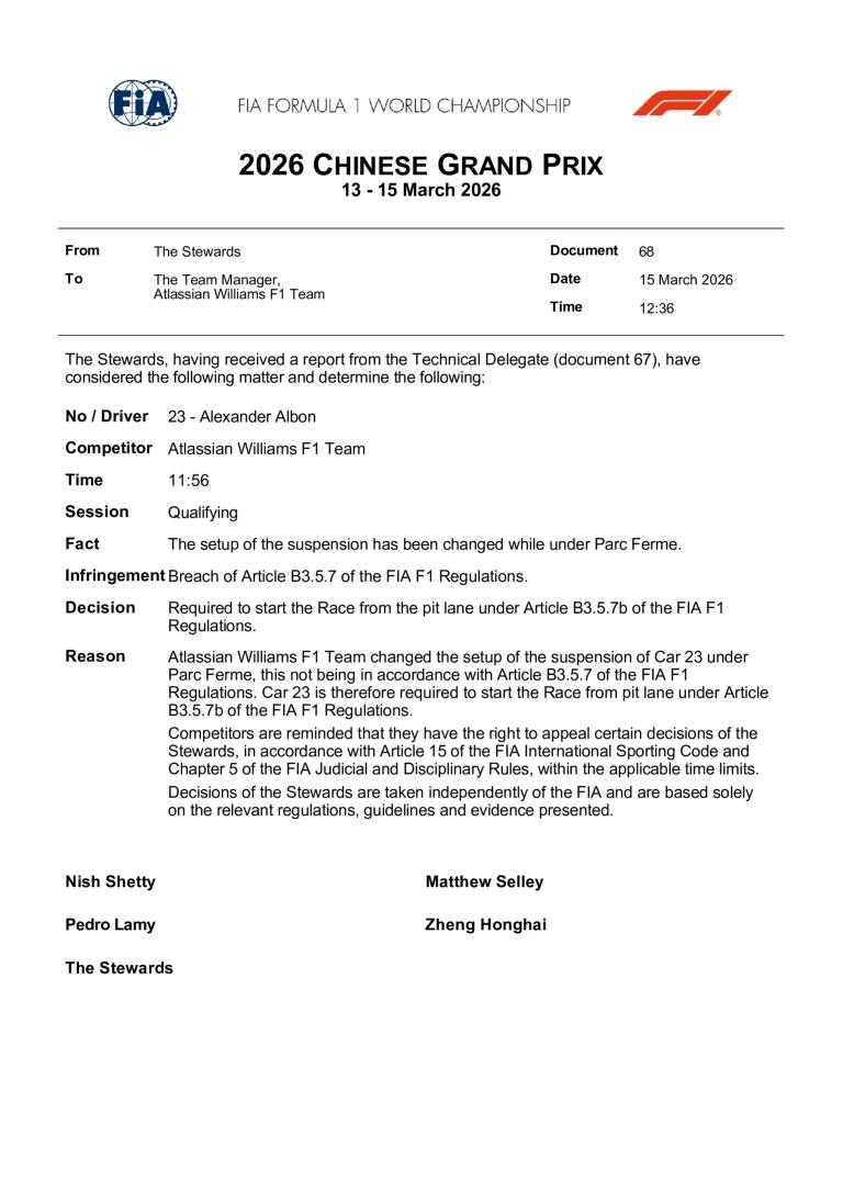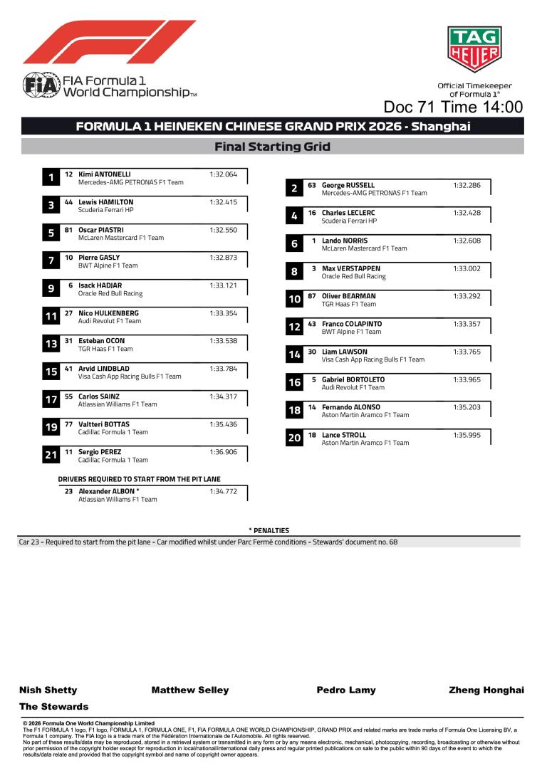 La grille de départ définitive du Grand Prix de Chine 2026 a été publiée par la FIA. Il est noter qu'Alex Albon démarrera de la voie des stands, ayant touché aux réglages de la suspension de sa Williams.