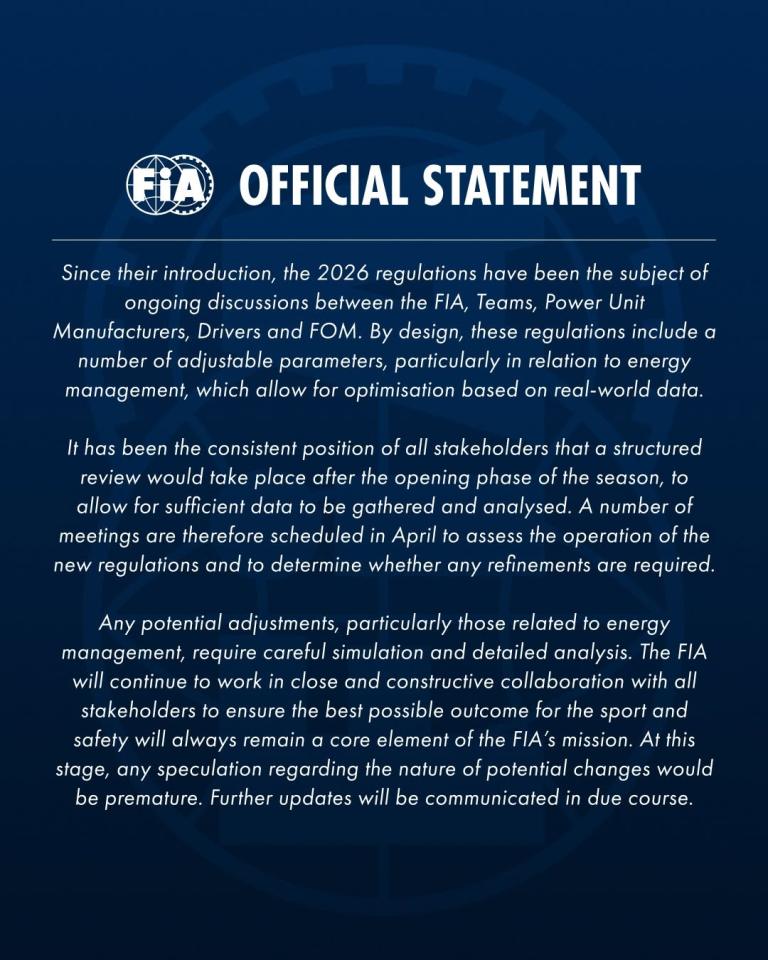 "Depuis leur introduction, les règlements 2026 font l'objet de discussions continues entre la FIA, les équipes, les motoristes, les pilotes et la FOM. Par conception, ces règlements incluent un certain nombre de paramètres ajustables, en particulier en ce qui concerne la gestion de l'énergie, qui permettent une optimisation fondée sur les données du monde réel."