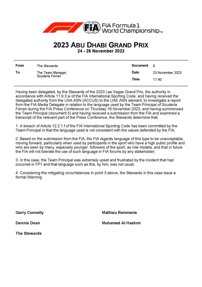 Pour Fred Vasseur, Ferrari : "Dans ce cas, le Directeur d'équipe était extrêmement contrarié et frustré par l'incident qui s'était produit en FP1, et ce langage de sa part n'était pas habituel."
