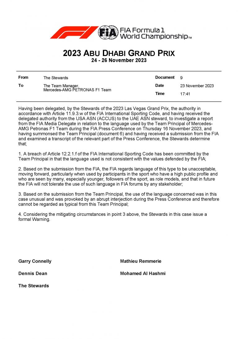 Pour Toto Wolff, Mercedes : "De l'aveu du Team Principal, l'utilisation du langage concerné était dans ce cas inhabituelle et a été provoquée par une interjection abrupte pendant la conférence de presse, et ne peut donc pas être considérée comme typique de ce Team Principal."