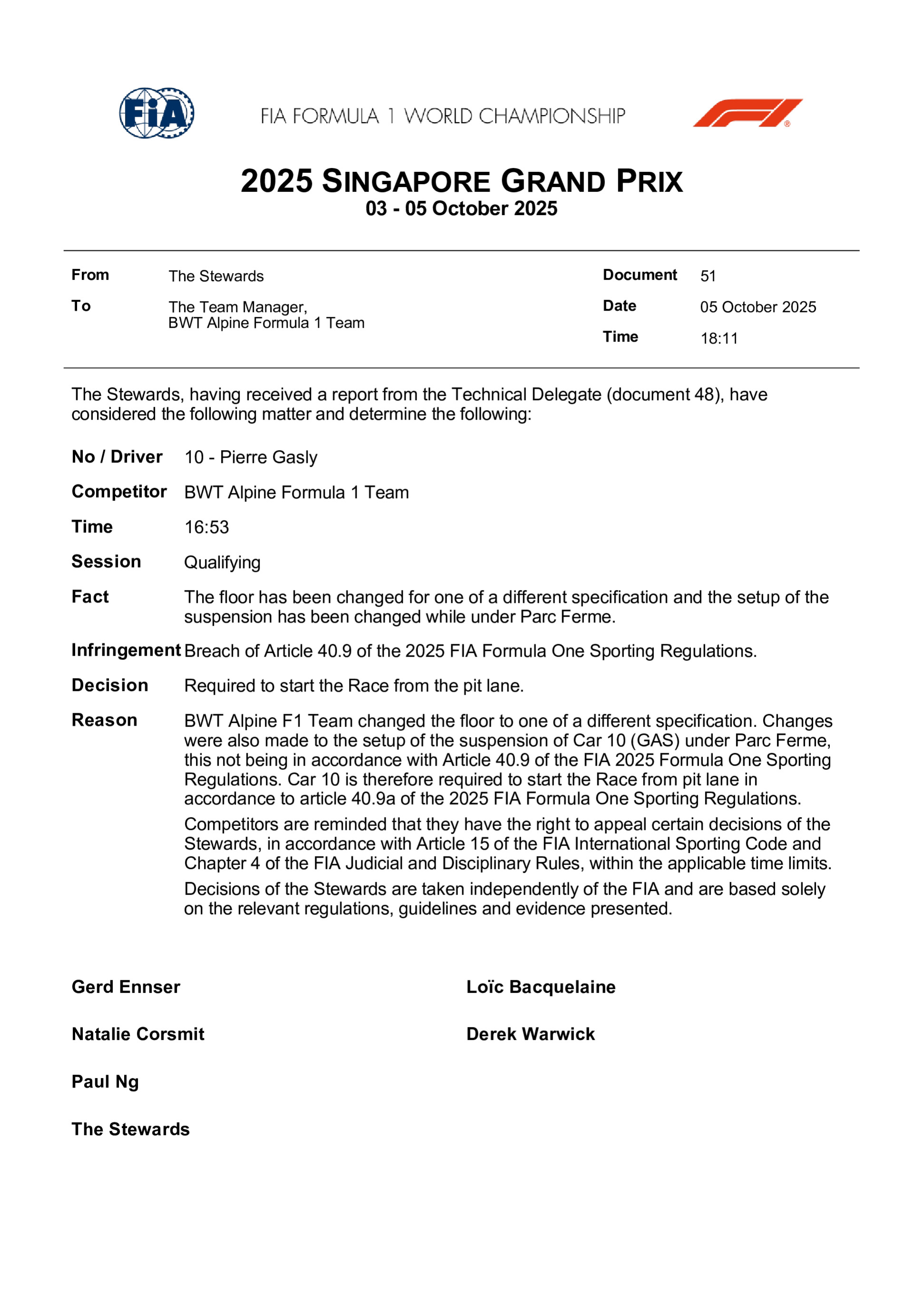 Pour la saison en cours, l'équipe BWT Alpine F1 Team participe avec la monoplace "A525", qui est propulsée par une unité de puissance Renault.