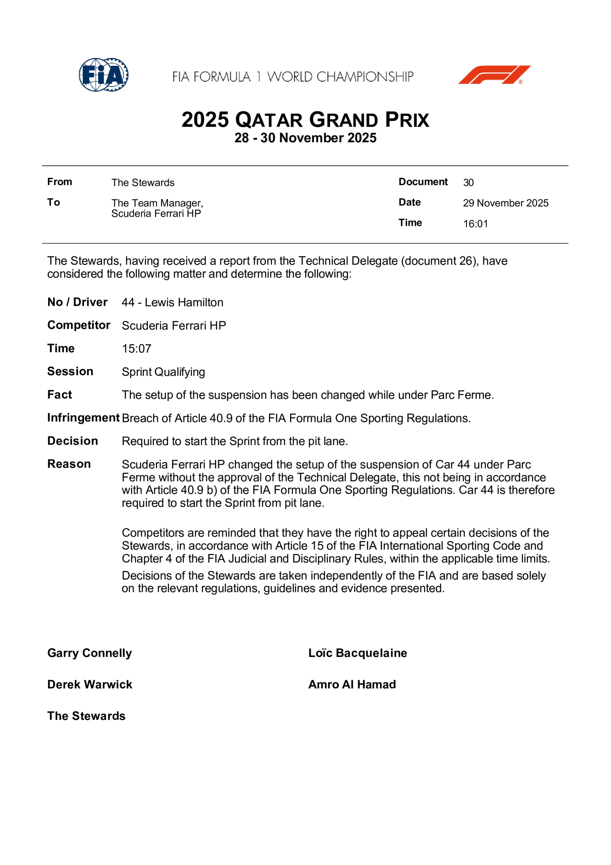 Lewis Hamilton a vécu un Sprint extrêmement difficile au Qatar, sa Ferrari s'avérant encore moins équilibrée qu'avant les modifications réalisées dans la nuit. Parti depuis la voie des stands après des changements importants validés au simulateur, il a exprimé sa frustration face à une voiture instable dans tous les domaines.