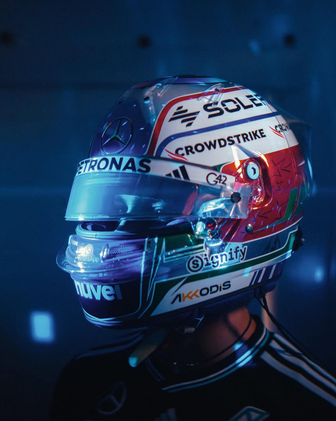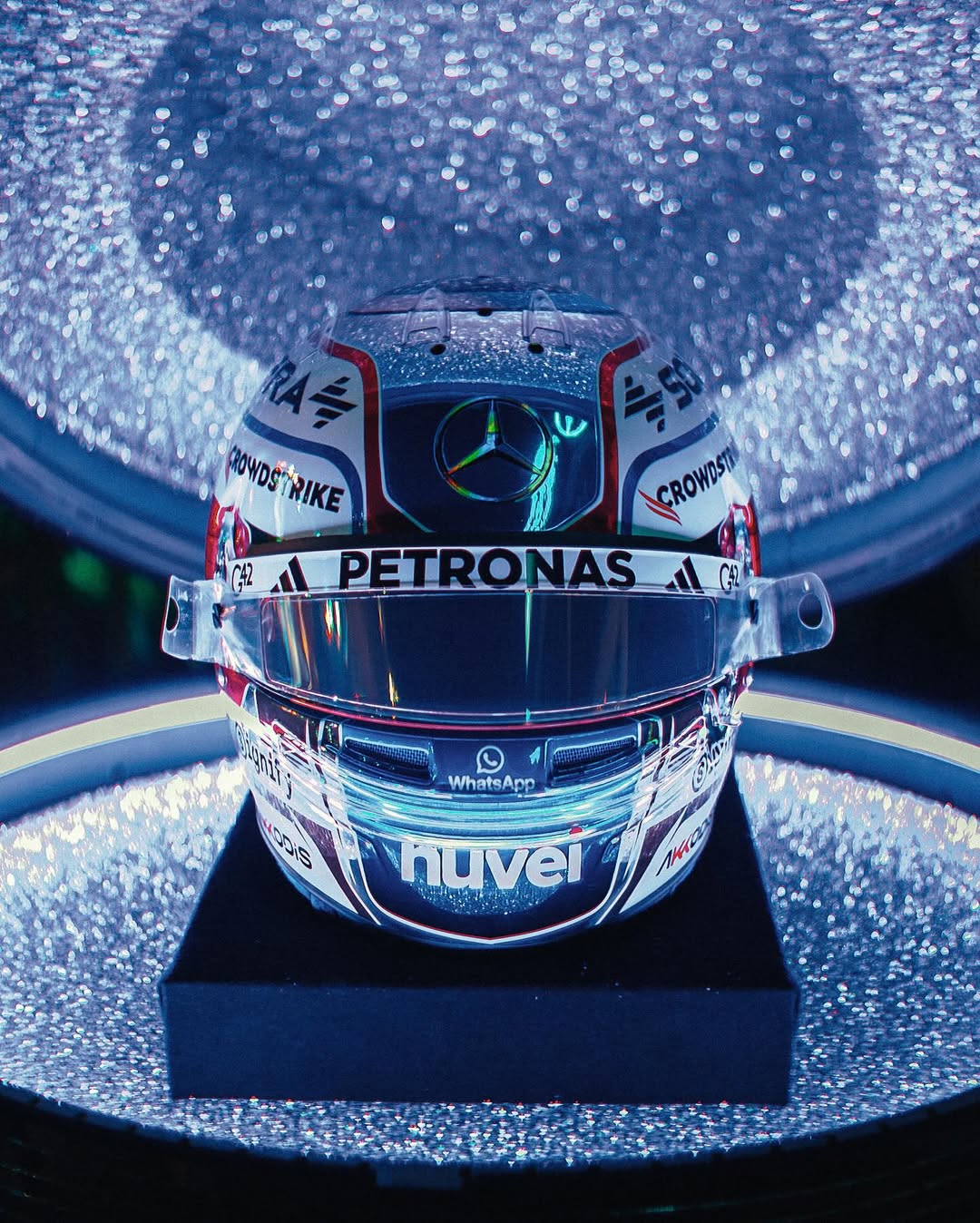 Andrea Kimi Antonelli opte pour le chrome pour son premier casque spécial Las Vegas. Le jeune italien brillera de mille feux sous les néons du Strip !