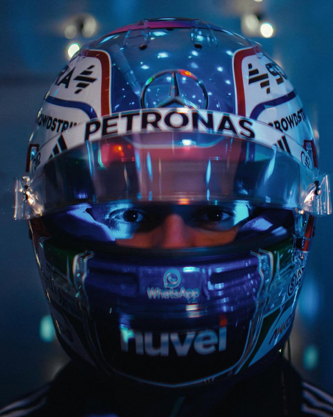 George Russell célèbre son 150ᵉ départ en Formule 1 à Las Vegas avec un casque spécialement conçu pour l'occasion. Le Britannique opte pour un design directement inspiré de l'univers des casinos, mêlant damiers dorés, motifs de cartes à jouer et une base sombre rehaussée d'effets pailletés qui évoquent les lumières du Strip.