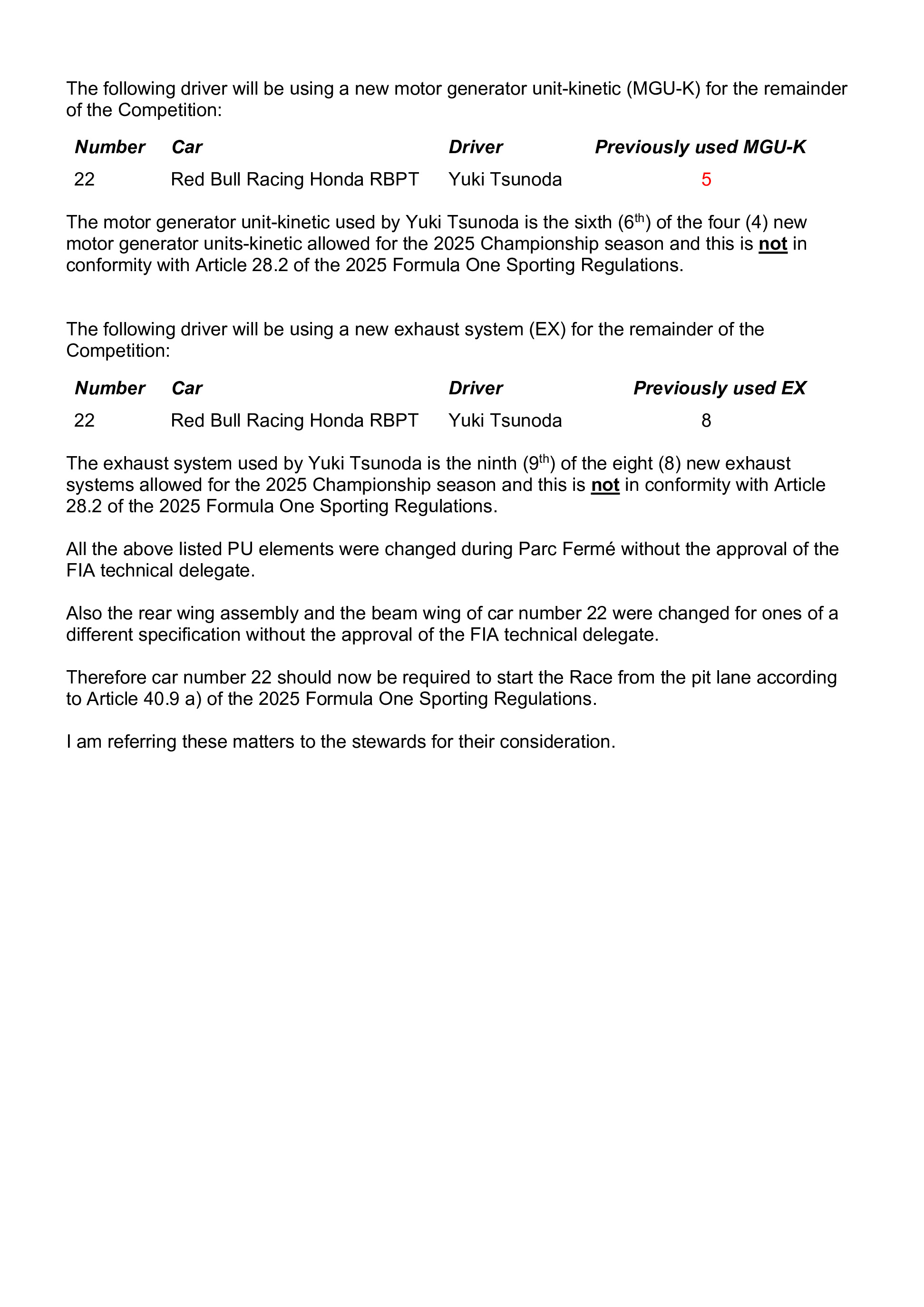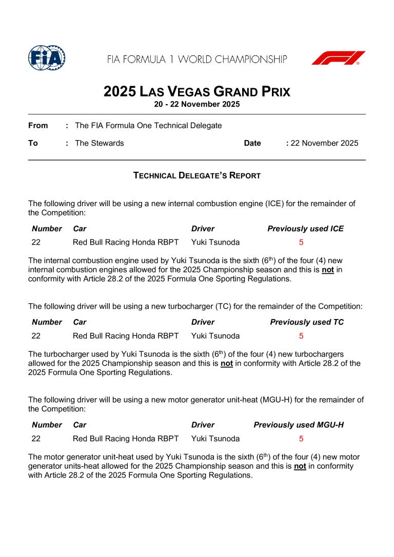 Ayant cassé le régime de parc fermé et avec plusieurs éléments changés, le pilote japonais Yuki Tsunoda prendra le départ depuis la voie des stands pour la course à Las Vegas.