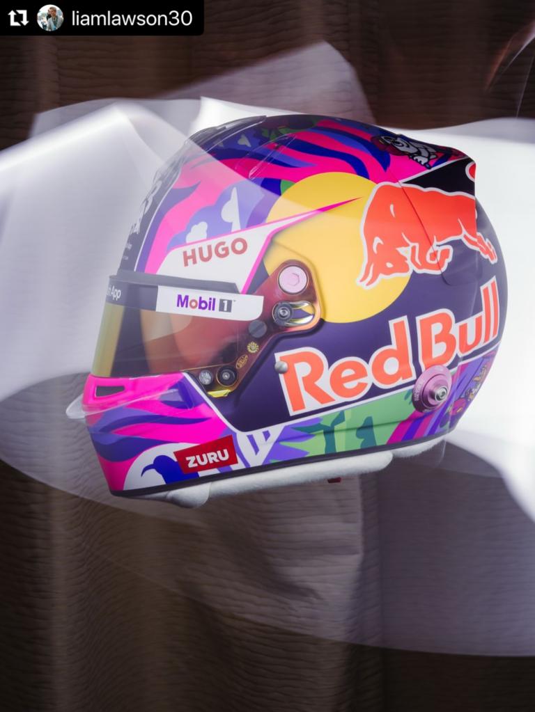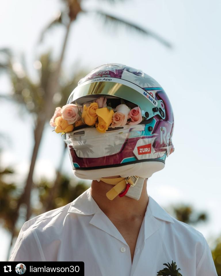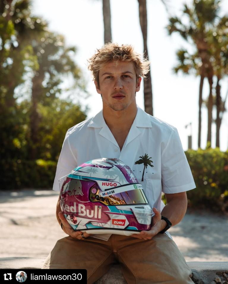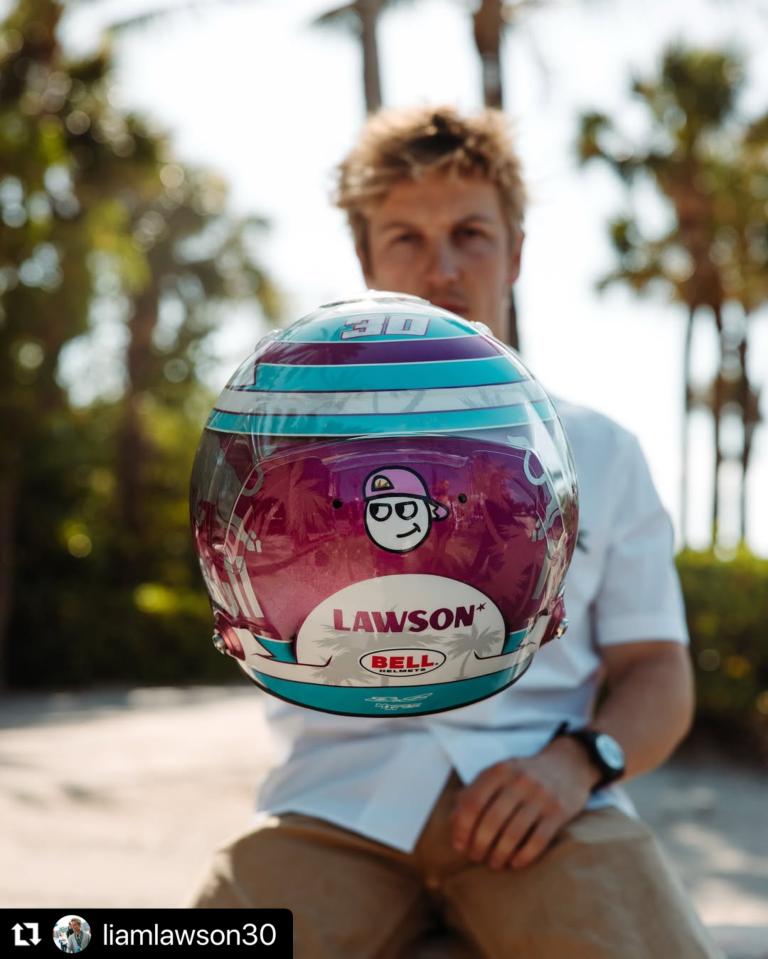 Casque spécial #MiamiGP pour Liam Lawson qui pilotera une Racing Bulls avec livrée rose fluo.