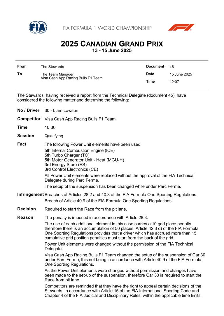 Liam Lawson ne prendra pas le départ du Grand Prix du Canada 2025 depuis la grille. Les commissaires ont en effet confirmé que le pilote néo-zélandais de l'équipe Visa Cash App RB (Racing Bulls) devra s'élancer depuis la voie des stands, à la suite de multiples infractions au règlement sportif.