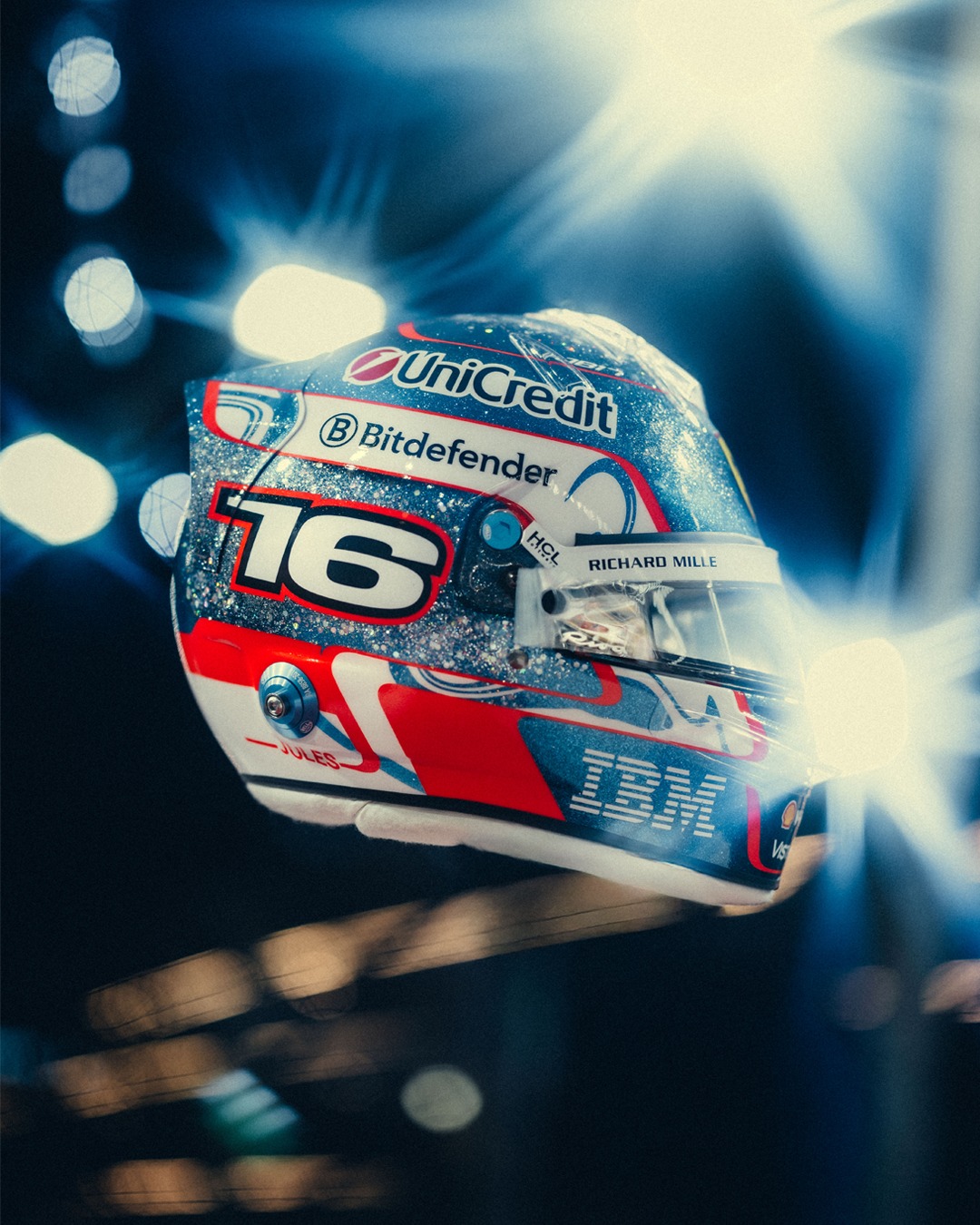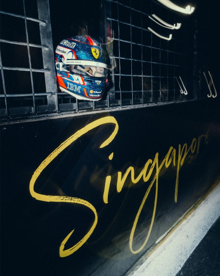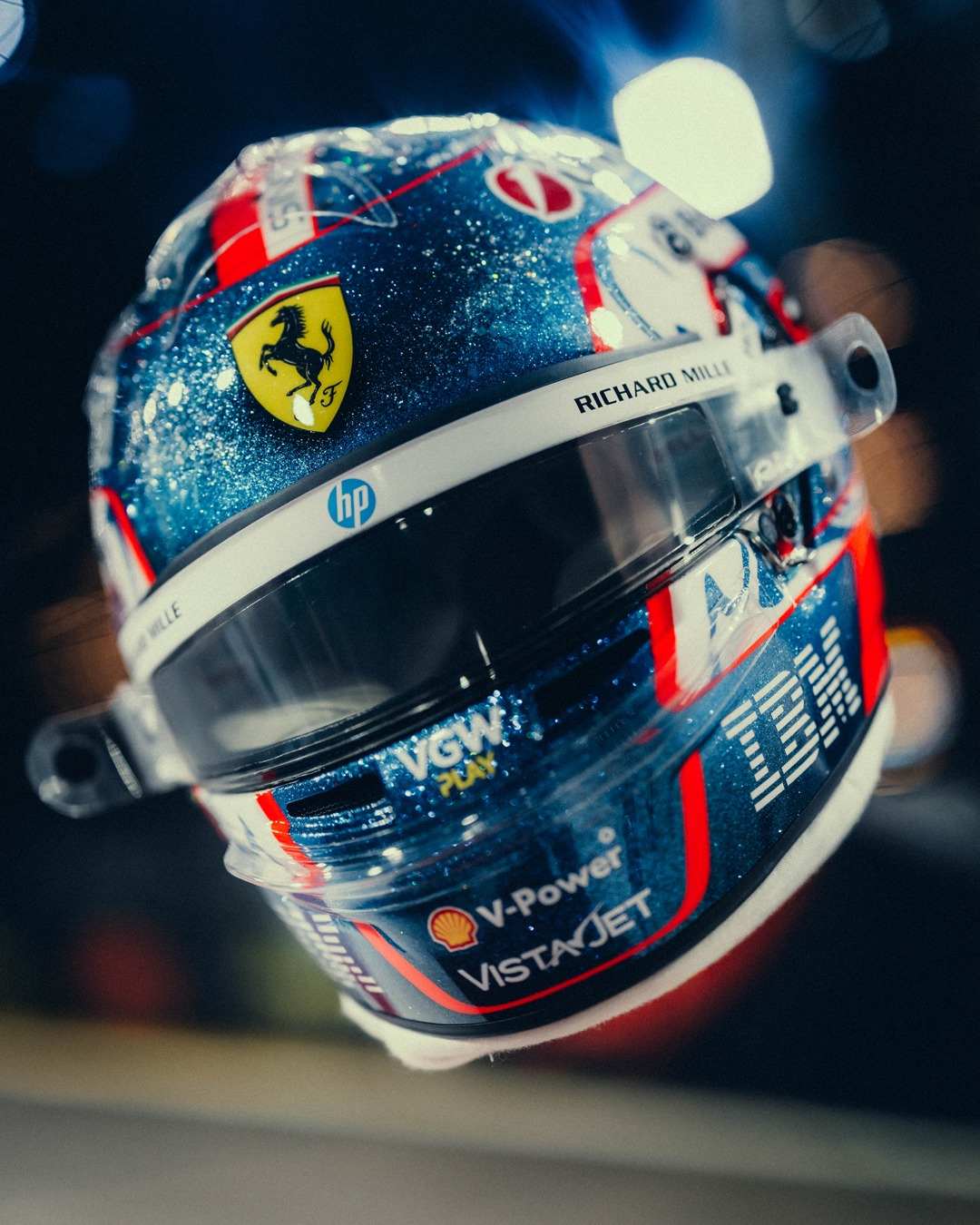 Charles Leclerc a un casque particulier pour le Grand Prix de Singapour 2025. Le Monégasque a choisi une variation pailletée de son design habituel, où dominent le bleu profond et le rouge, complétés par une finition pailletée qui capte les lumières de Marina Bay.