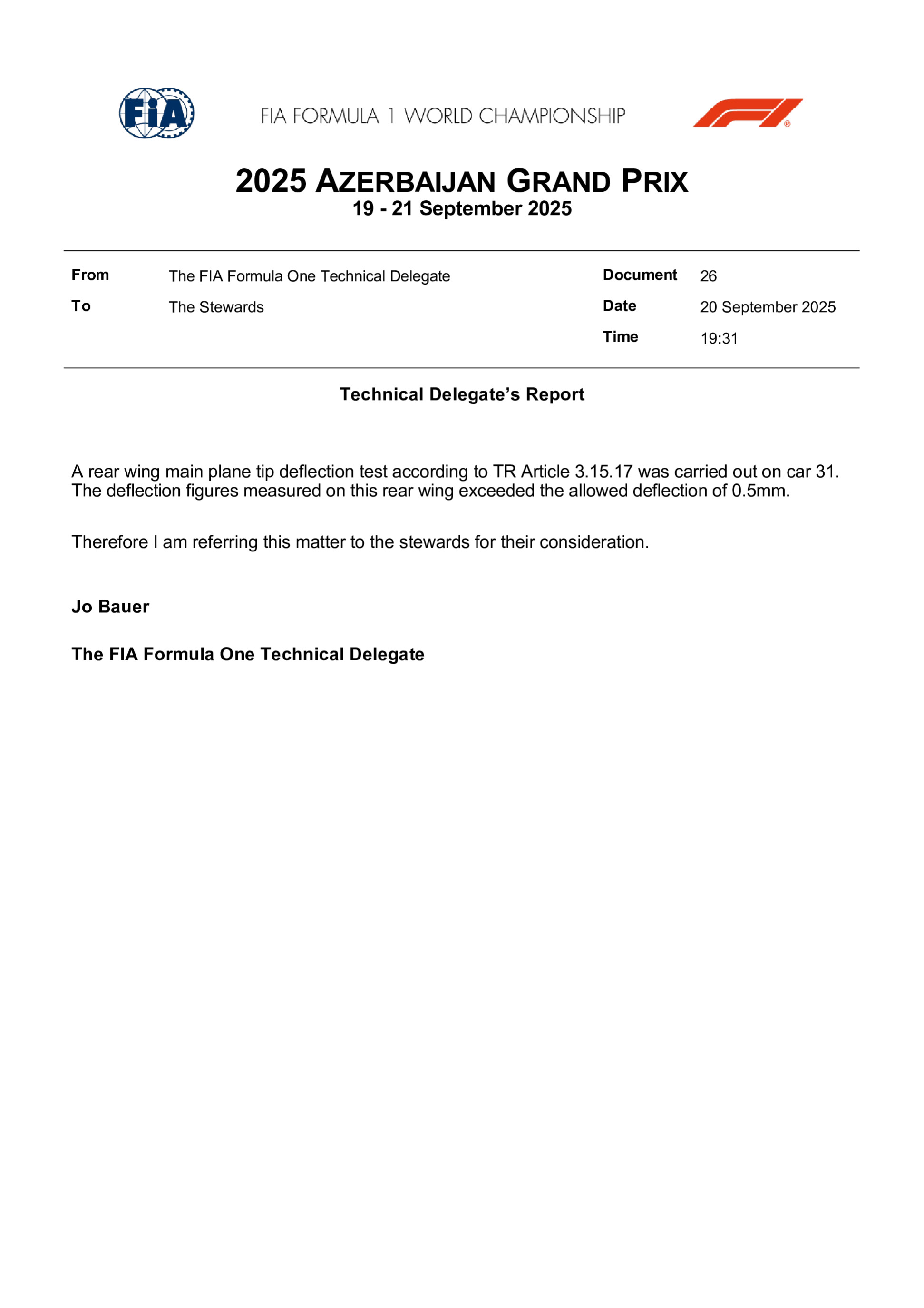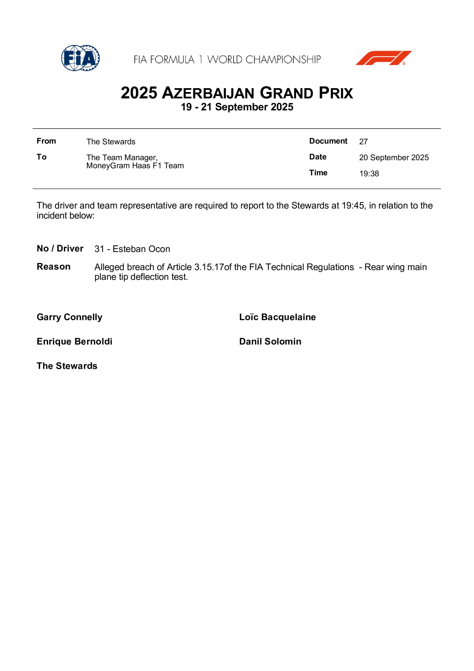 À Bakou, la Haas d'Esteban Ocon a échoué au test de flexibilité de l'aileron arrière mené après les qualifications, conformément à l'article 3.15.17 du règlement technique. Le délégué technique de la FIA a constaté une déflexion supérieure à la limite autorisée de 0,5 mm.
