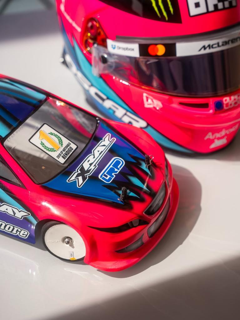 Pour Las Vegas, Oscar Piastri a dévoilé un casque entièrement nouveau, directement inspiré de ses premières années en compétitions de voitures radiocommandées. Le pilote australien fait le lien avec une époque où il enchaînait les victoires en modélisme, arborant déjà cette combinaison de rose vif, de bleu et de noir qu'il reprend aujourd'hui presque à l'identique.