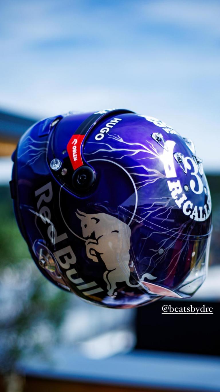 Le design, violet avec des éclairs et un cheval pur sang, reflète parfaitement le style dynamique et exubérant de Ricciardo. Ces détails capturent l'essence de la personnalité de l’Australien sur et en dehors de la piste.