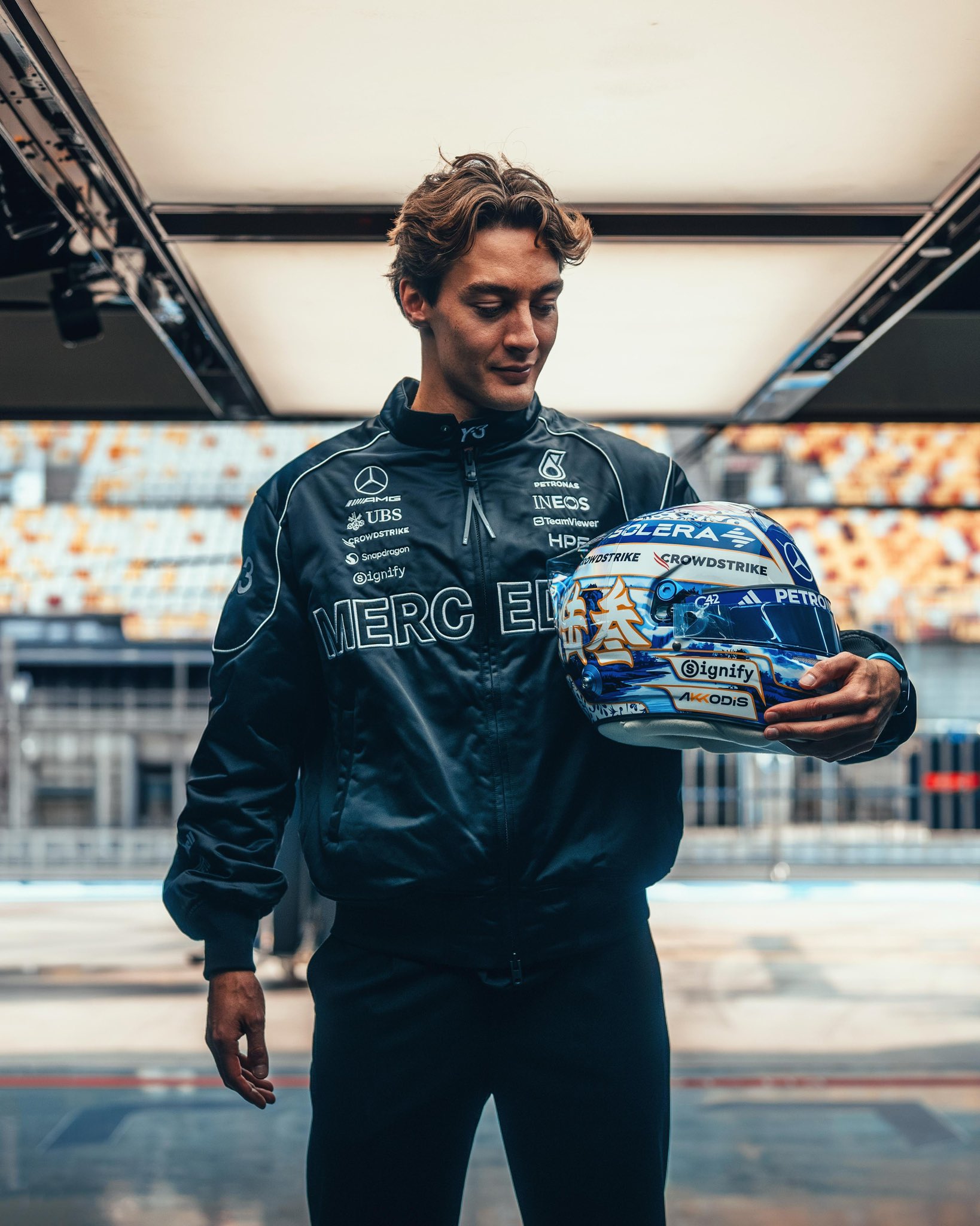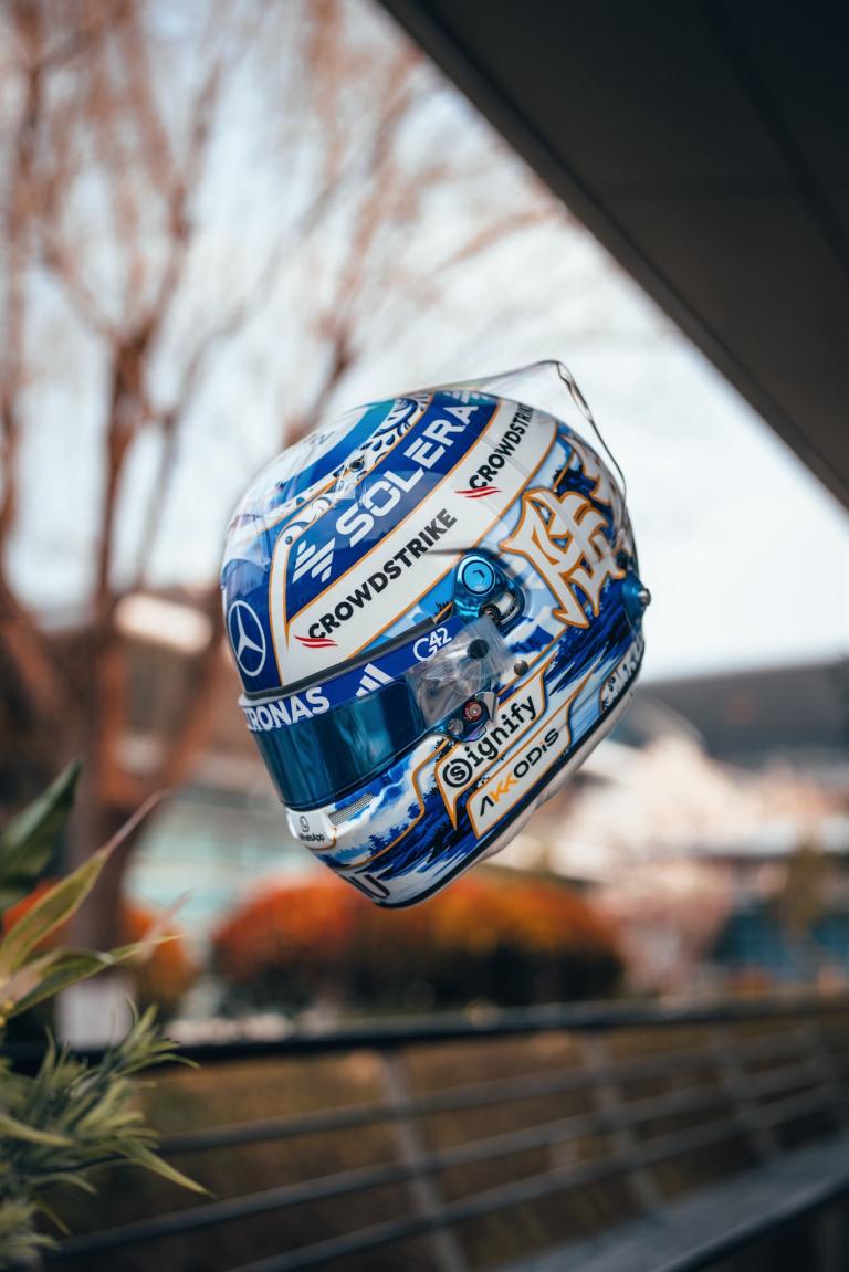 À l'occasion du Grand Prix de Chine 2026, deuxième manche de la saison, le pilote britannique de Mercedes dévoile un casque spécialement conçu pour l'étape de Shanghai. Cette livrée unique s'inspire directement de plusieurs éléments culturels associés au pays hôte, avec une palette dominée par le bleu et le blanc qui évoque la porcelaine chinoise traditionnelle. Les motifs floraux et décoratifs rappellent ce style artistique emblématique, tandis ...
