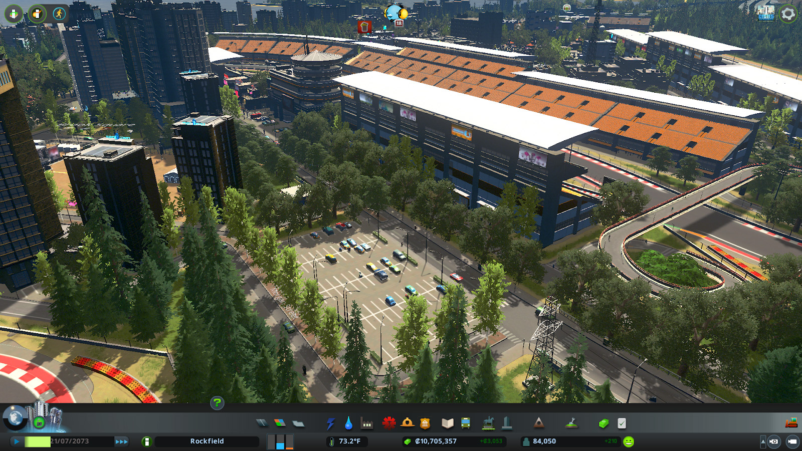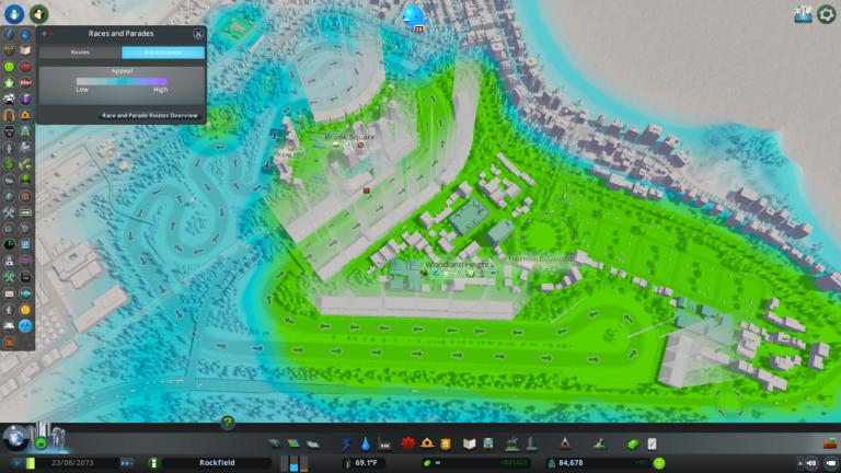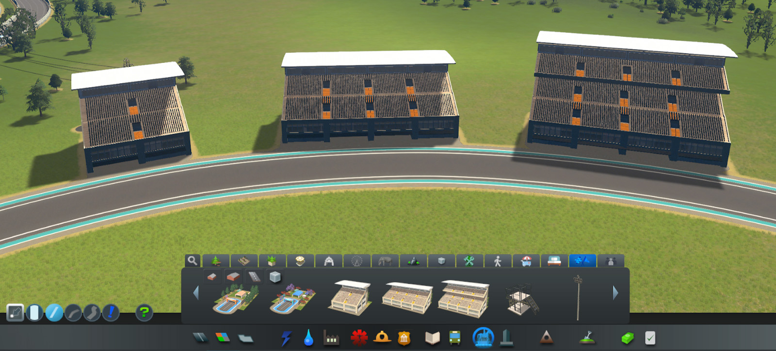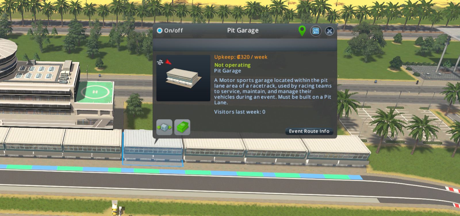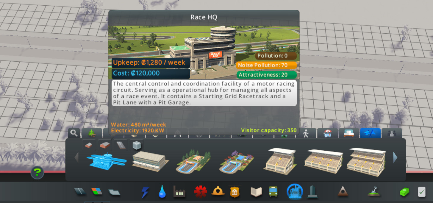Les tribunes, déclinées en plusieurs tailles, influencent directement l'attractivité de l'événement et le nombre de spectateurs. Une nouvelle vue d'information dédiée aux courses et parades permet de visualiser les tracés validés, leur sens de circulation ainsi que leur attractivité. Les joueurs peuvent également planifier leurs compétitions en choisissant la catégorie (Hyper Car, Formula ou Circuit Cruisers), le nombre de tours, le niveau de l'épreuve et le prix des billets, avec un impact direct sur les coûts et l'affluence.