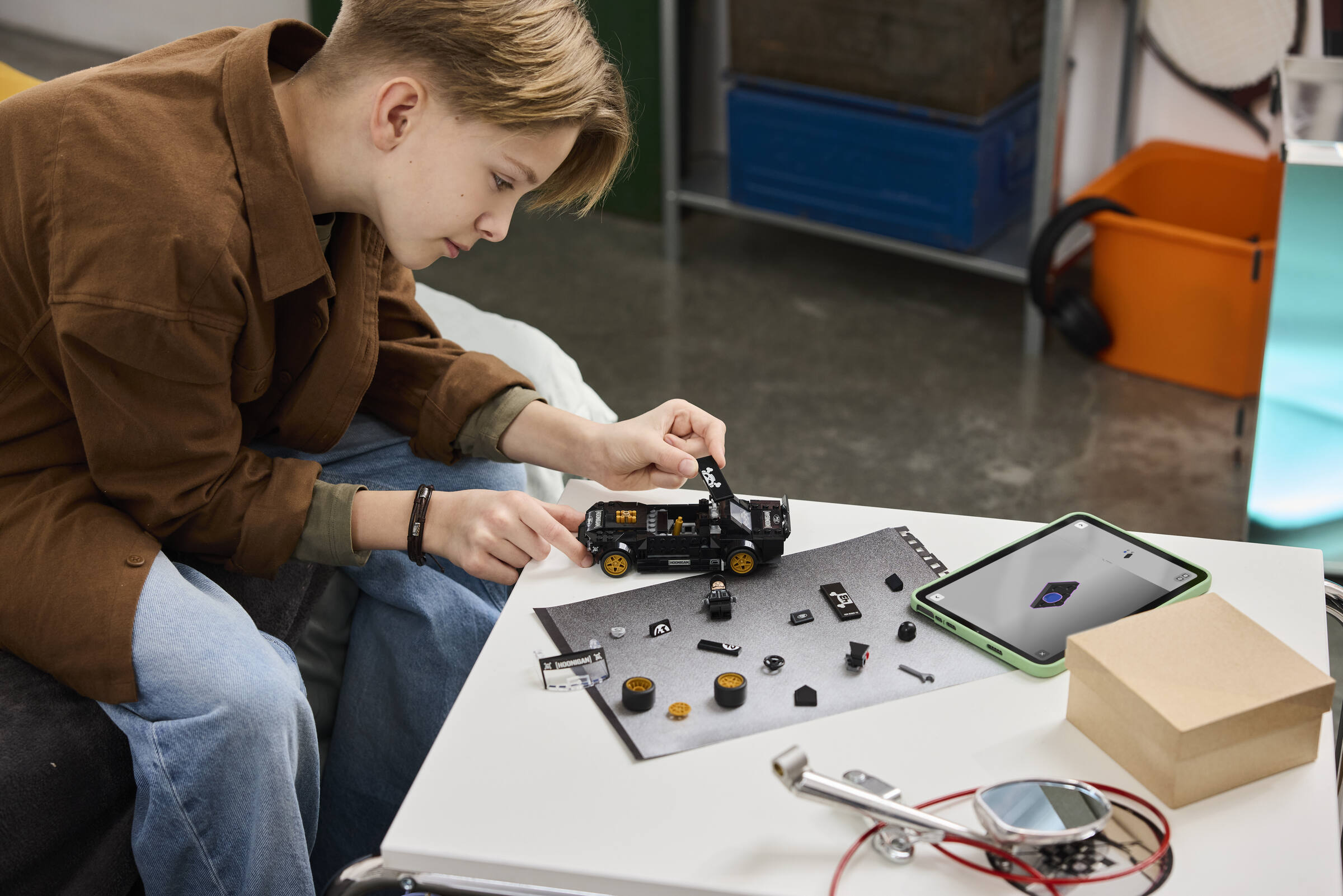 La miniature reprend plusieurs éléments caractéristiques de cette première Hoonicorn, avec sa silhouette de Mustang fastback, son imposante admission sur le capot, ses jantes dorées, son large kit carrosserie et sa livrée noire marquée du célèbre numéro 43. LEGO y ajoute également une minifigurine de feu Ken Block, avec casque et tenue Hoonigan (sans motoneige).