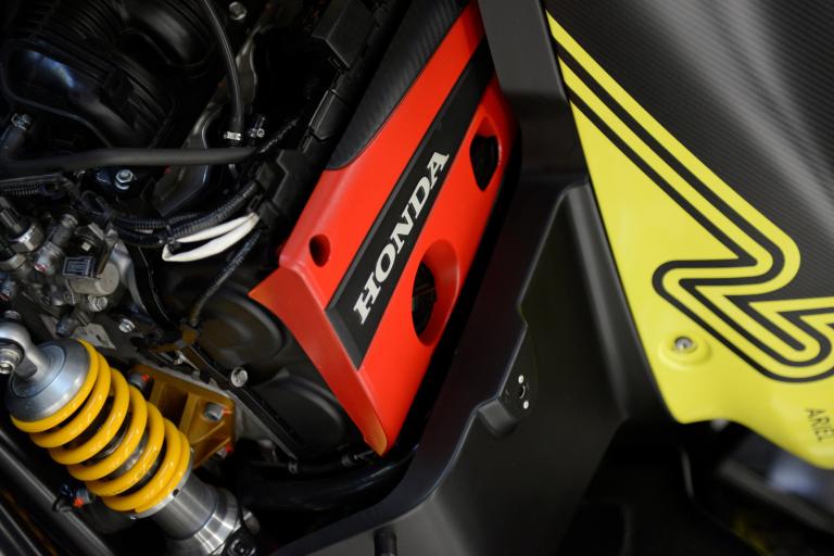 Au cœur du projet, on retrouve une évolution en profondeur du quatre-cylindres 2,0 litres Honda K20C, dont l'architecture est conservée mais dont la quasi-totalité des éléments internes et périphériques est revue. Pistons et bielles forgés, culasse retravaillée, arbres à cames spécifiques, équilibrage complet des masses, système de lubrification adapté aux fortes contraintes en appui, turbo plus imposant soufflant jusqu'à 1,7 bar, injecteurs de 1400 cc et gestion moteur dédiée : l'ensemble vise un fonctionnement typé compétition. Le résultat atteint 525 bhp, soit environ 532 ch, pour 550 Nm, avec un régime maximal de 8200 tr/min. Trois cartographies sont proposées, avec des niveaux de puissance de 400 bhp (405 ch), 500 bhp (507 ch) et 525 bhp (532 ch), sélectionnables depuis le cockpit.