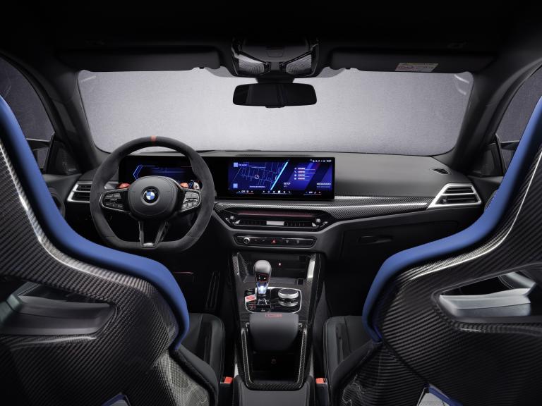 La M2 CS se reconnaît à son aileron Ducktail en PRFC, son toit carbone apparent, ses coques de rétroviseurs M et son diffuseur arrière spécifique. Elle reçoit également des éléments noir mat ou noir brillant, une calandre redessinée et plusieurs teintes exclusives, dont Brooklyn Grey et Portimao Blau. À l'intérieur, les sièges baquets chauffants en cuir Merino sont compatibles harnais, et dotés d'un appui-tête amovible pour le casque. Le volant en Alcantara à méplat reçoit les palettes carbone, les touches M Drive, et un repère rouge à midi. La console centrale et les inserts sont en fibre de carbone brute, et l'ambiance est complétée par une garniture de pavillon anthracite et un éclairage d'ambiance personnalisable. Le logo "CS" rétroéclairé est présent sur les contre-portes et la console.