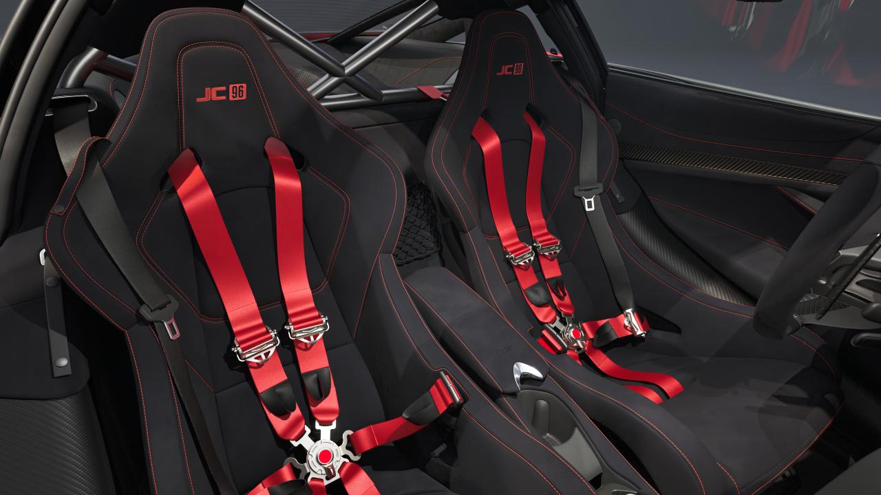 L'habitacle adopte un traitement spécifique avec sellerie Alcantara, éléments en titane sombre brossé et détails dorés sur les pédales, les commandes de sélection de rapport ou encore une plaque commémorative dédiée. Des logos JC96 apparaissent sur les appuie-têtes et accoudoirs, tandis que certains clients pourront opter pour un habillage complet "Tribute Livery", limité à quatre voitures, reprenant intégralement le motif "Tiger Stripe" peint à la main par MSO.