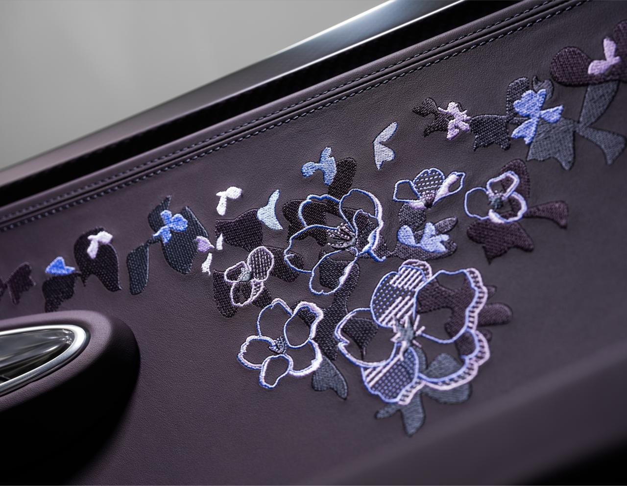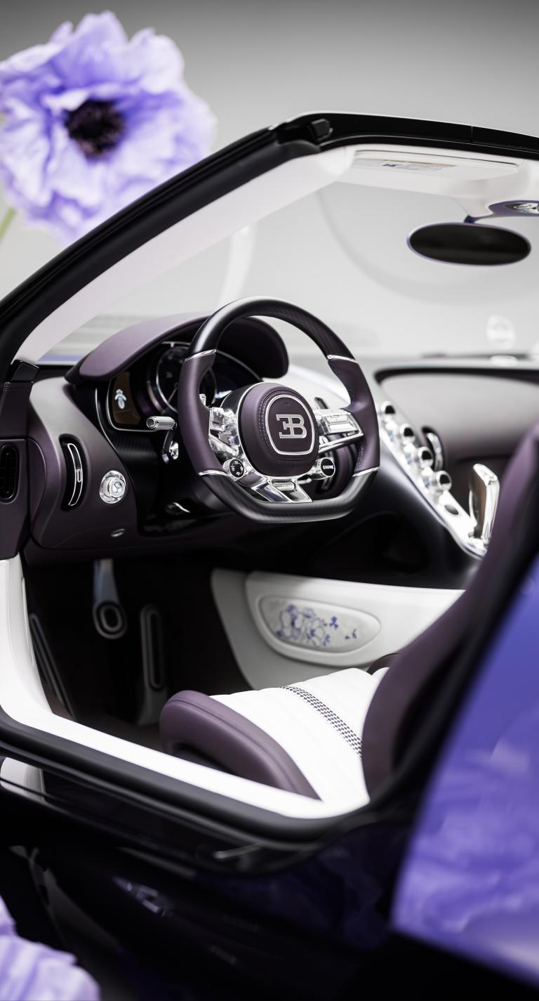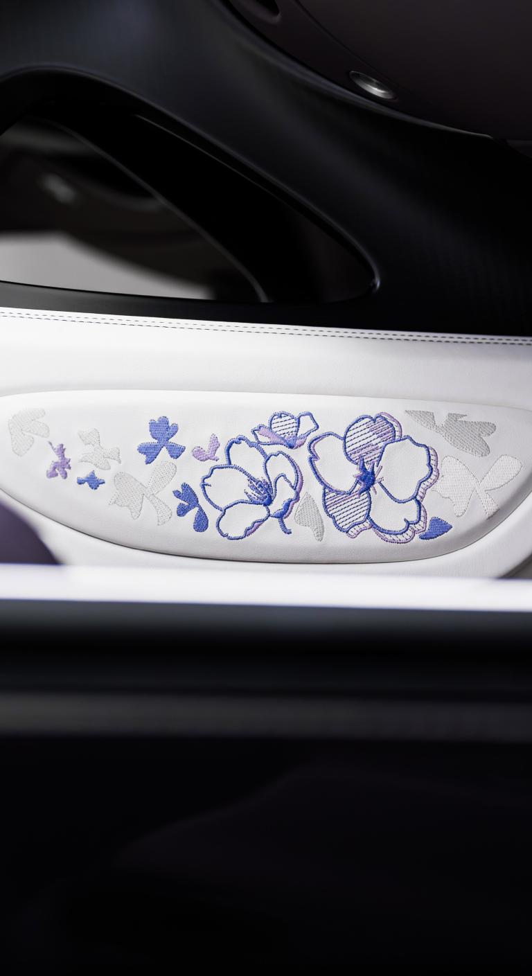 Cette exemplaire unique se distingue surtout par sa présentation. La carrosserie reçoit une teinte spécifique "Lavender", associée à une fibre de carbone apparente teintée violet, tandis que l'aileron arrière escamotable accueille un décor floral peint à la main avec l'inscription "Caroline". L'habitacle reprend la même logique avec une combinaison de cuirs blancs, bleus foncés et violets, des broderies florales complexes sur les appuie-tête et les contre-portes, ainsi qu'un traitement chromatique cohérent jusqu'au célèbre éléphant de Rembrandt Bugatti intégré au levier de vitesses.