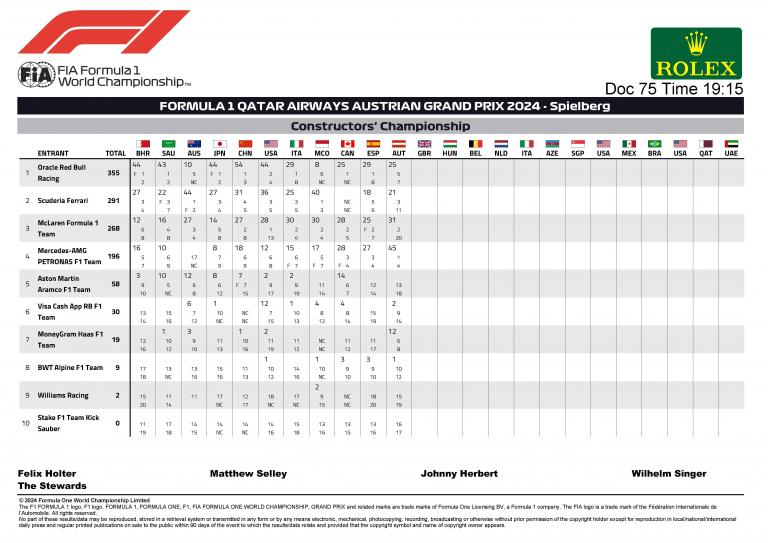 Les pilotes Sauber, Valtteri Bottas et Zhou Guanyu, attendent toujours leurs premiers points de la saison 2024, finissant respectivement 16e et 17e. Fernando Alonso, malgré le meilleur tour de la course inscrit à la toute fin de la course et chipé à Verstappen, a terminé 18e, en difficulté avec le rythme de son Aston Martin et une pénalité de 10 secondes pour avoir poussé Zhou hors de la piste.