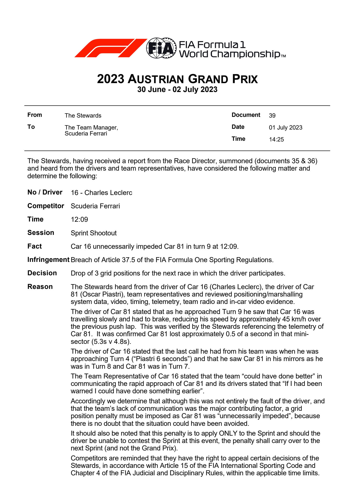 Suite au shootout, une pénalité a vu Charles Leclerc se faire rétrograder sur la grille de départ du sprint de la sixième à la neuvième place, ce qui a promu le duo d'Aston Martin, Fernando Alonso et Lance Stroll, ainsi qu'Esteban Ocon d'Alpine. Le pilote Ferrari ait été reconnu coupable d'avoir gêné le rookie de McLaren, Oscar Piastri, lors de la séance de qualifications.