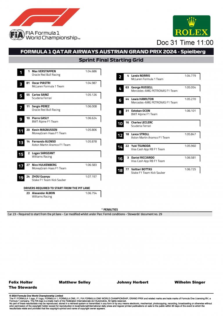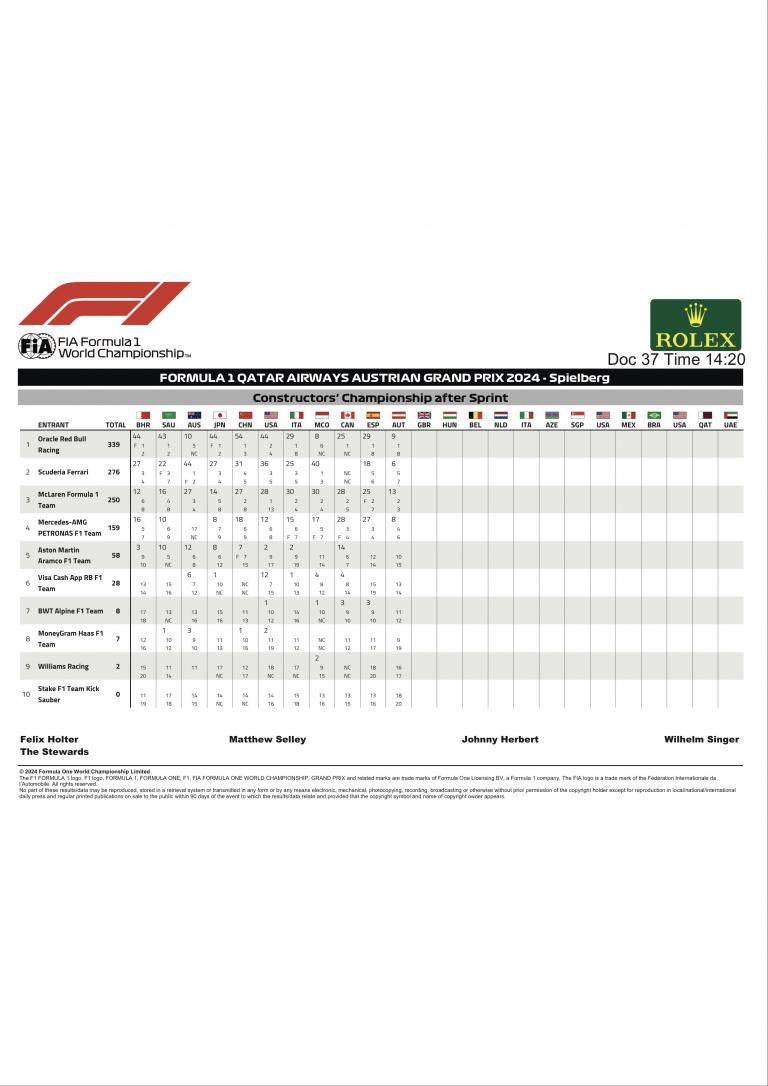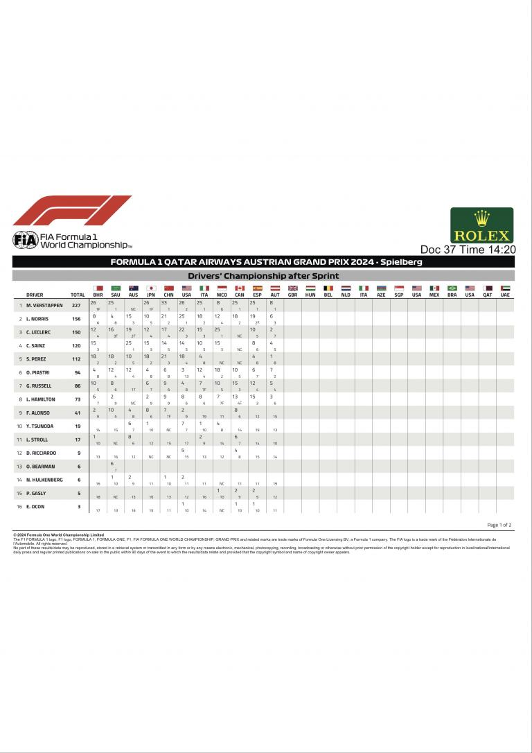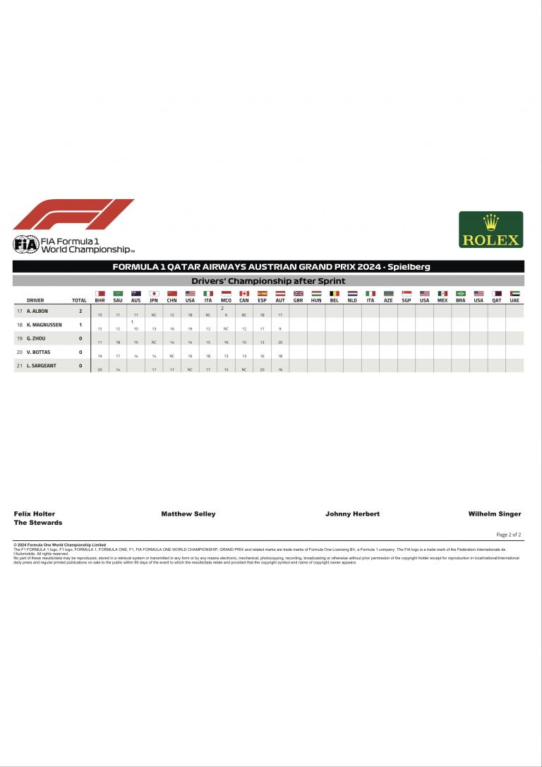 À mi-course, Verstappen a consolidé son avance, finissant 4,6 secondes devant Piastri, avec Norris à sept dixièmes derrière. Hamilton et Russell ont maintenu leurs positions autour de Sainz, Leclerc terminant septième et Perez prenant le dernier point attribué en course Sprint avec une huitième position. Magnussen a réalisé une solide performance pour finir neuvième, suivi de Stroll et des Alpine d'Ocon et Gasly, qui n'ont pas réussi à capitaliser sur leurs qualifications.