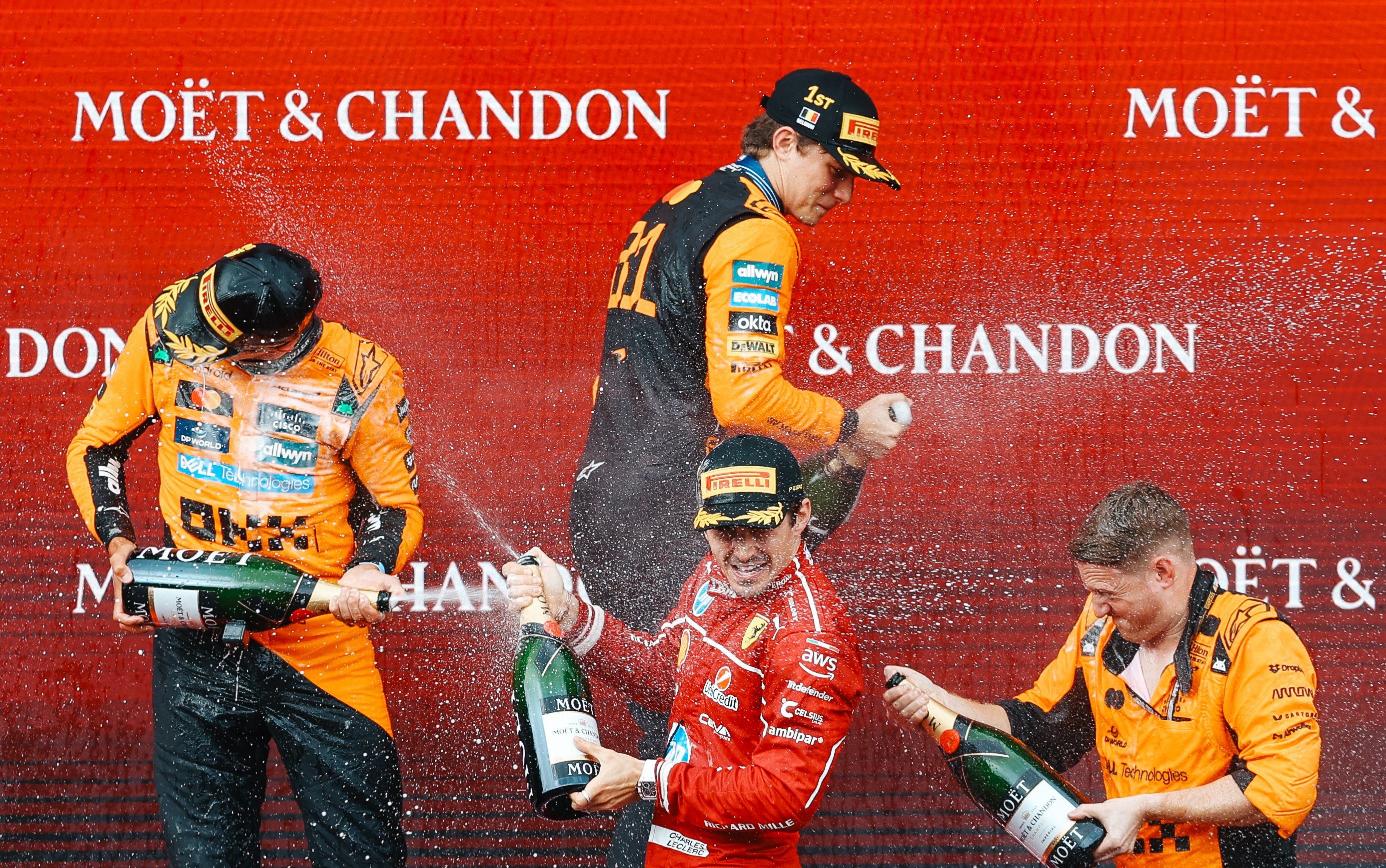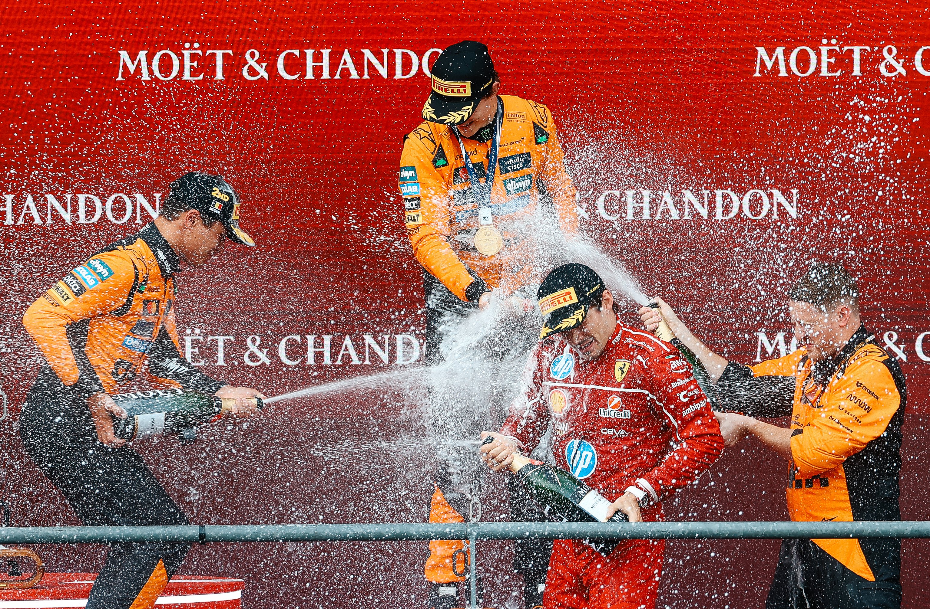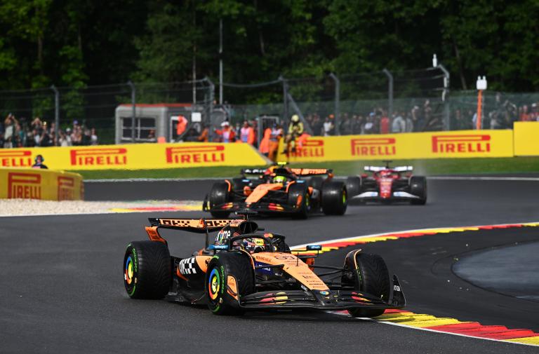 Alors que la piste séchait, McLaren a rappelé Piastri dès le 12e tour pour chausser les mediums. Norris, resté en piste un tour de plus avant de basculer sur les durs, est ressorti avec neuf secondes de retard. Malgré l'usure plus rapide de ses gommes, Piastri a géré son rythme jusqu'au bout. L'écart est descendu à 3.1 s dans l'avant-dernier tour, mais une petite erreur de Norris à La Source a mis fin à tout suspense. L'Australien originaire de Nouvelle-Galles du Sud s'impose avec 3.4 s d'avance, et prend 16 points d'avance au championnat.