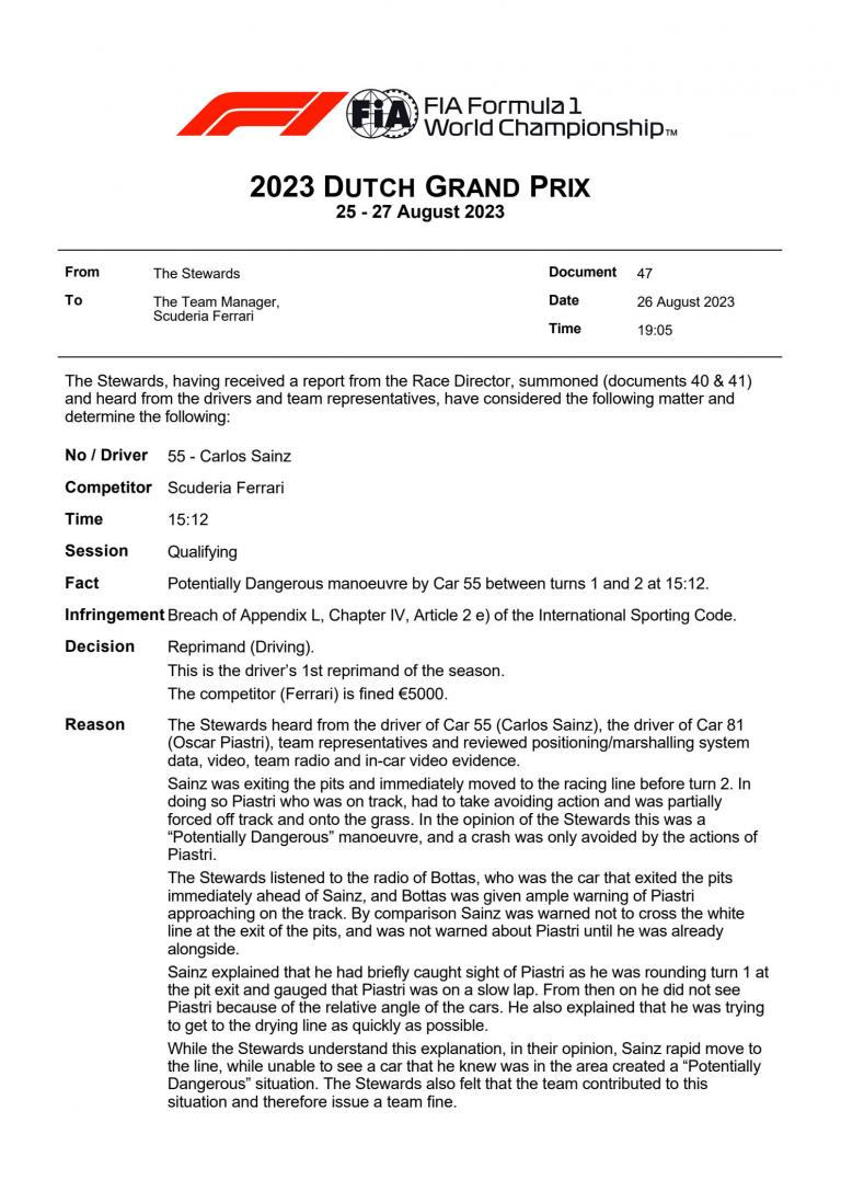 Faisons une parenthèse concernant Piastri et un certain Sainz. Lors de la Q1, Sainz sortait de la voie des stands derrière l'Alfa Romeo de Valtteri Bottas, ignorant initialement la présence de Piastri. Ce dernier, en train d'effectuer un tour lent mais aux côtés de la Ferrari, a été contraint de quitter la piste pour éviter une collision lorsque Sainz s'est dirigé vers la trajectoire des virages 2 et 3. Cette action a déclenché une enquête qui s'est soldée par une simple réprimande pour le pilote et 5000 € d'amende pour l'écurie italienne. Sanction light ? A vous de juger…
