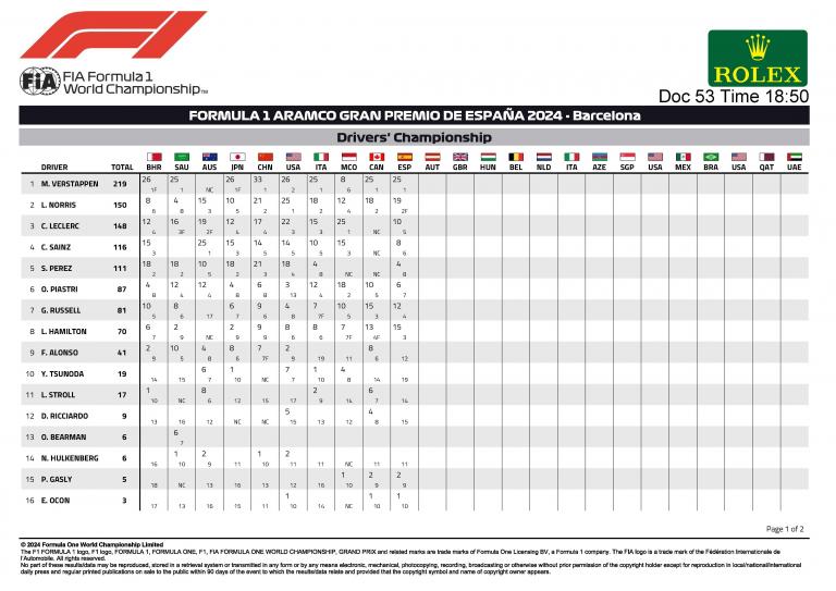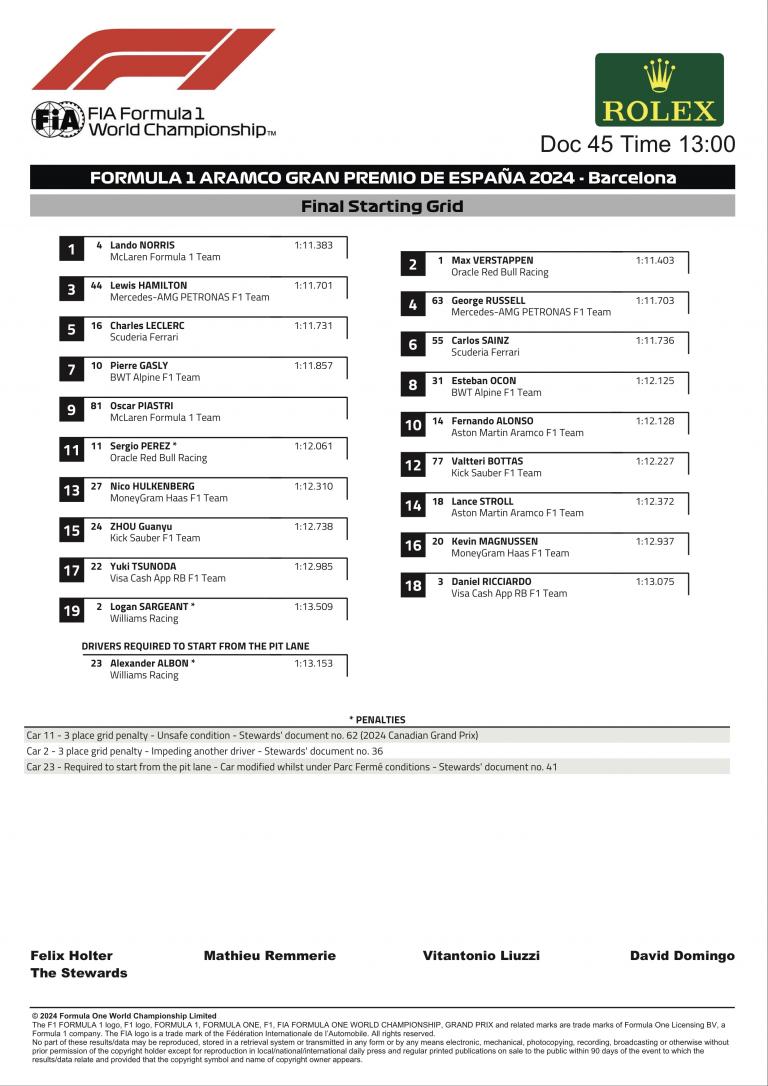 Zhou Guanyu Sauber a terminé treizième sur sa Sauber, devant Lance Stroll, le coéquipier d'Alonso. Daniel Ricciardo a pris la quinzième place après un week-end compliqué pour VCARB, marqué par l'introduction d'une nouvelle mise à jour majeure qui semble moins compétitive que le package précédent. Yuki Tsunoda, sur la deuxième Visa Cash App RB, a terminé à une laboureuse dix-neuvième position alors qu'il performait admirablement jusqu'à l'Espagne.