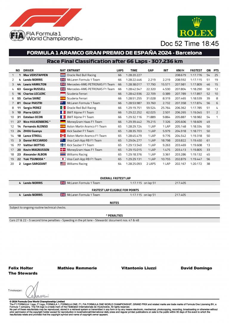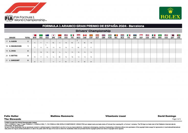 Lors de cette journée sans drapeaux jaunes ni abandons, Bottas, Magnussen et Albon ont respectivement fini seizième, dix-septième et dix-huitième. Logan Sargeant (Williams) a clôturé le classement en vingtième position, c'est malheureusement un peu son lot dominical.