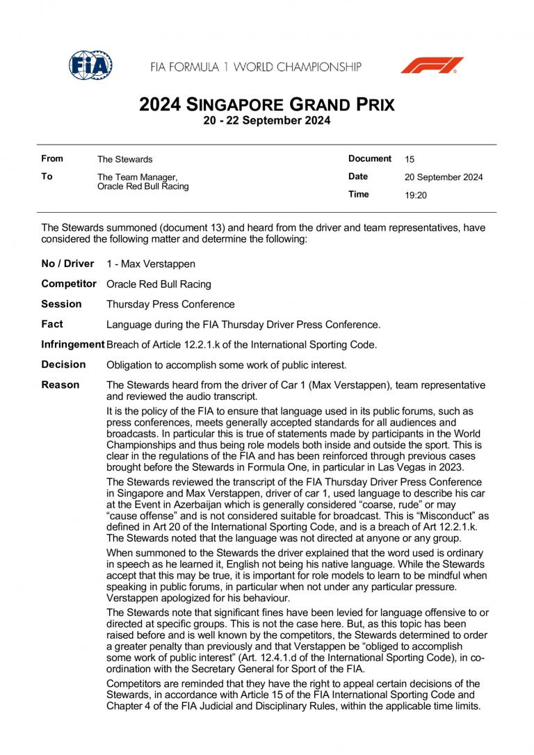 En effet, le lendemain de cette déclaration, la FIA a pris des mesures à l'encontre du pilote néerlandais. Les commissaires ont statué sur la question en référence à l'article 12.2.1.k du Code Sportif International, qui concerne les conduites jugées inappropriées. Selon le rapport de l'infraction, Verstappen a été convoqué avec ses représentants, où il a dû s'expliquer sur son langage jugé "grossier" et "susceptible d'offenser" lors de la conférence de presse. Bien que la FIA ait reconnu que le langage n'était pas dirigé contre une personne ou un groupe spécifique, les commissaires ont jugé important que les modèles du sport se montrent plus conscients de leur langage en public, même en dehors de situations de forte pression.