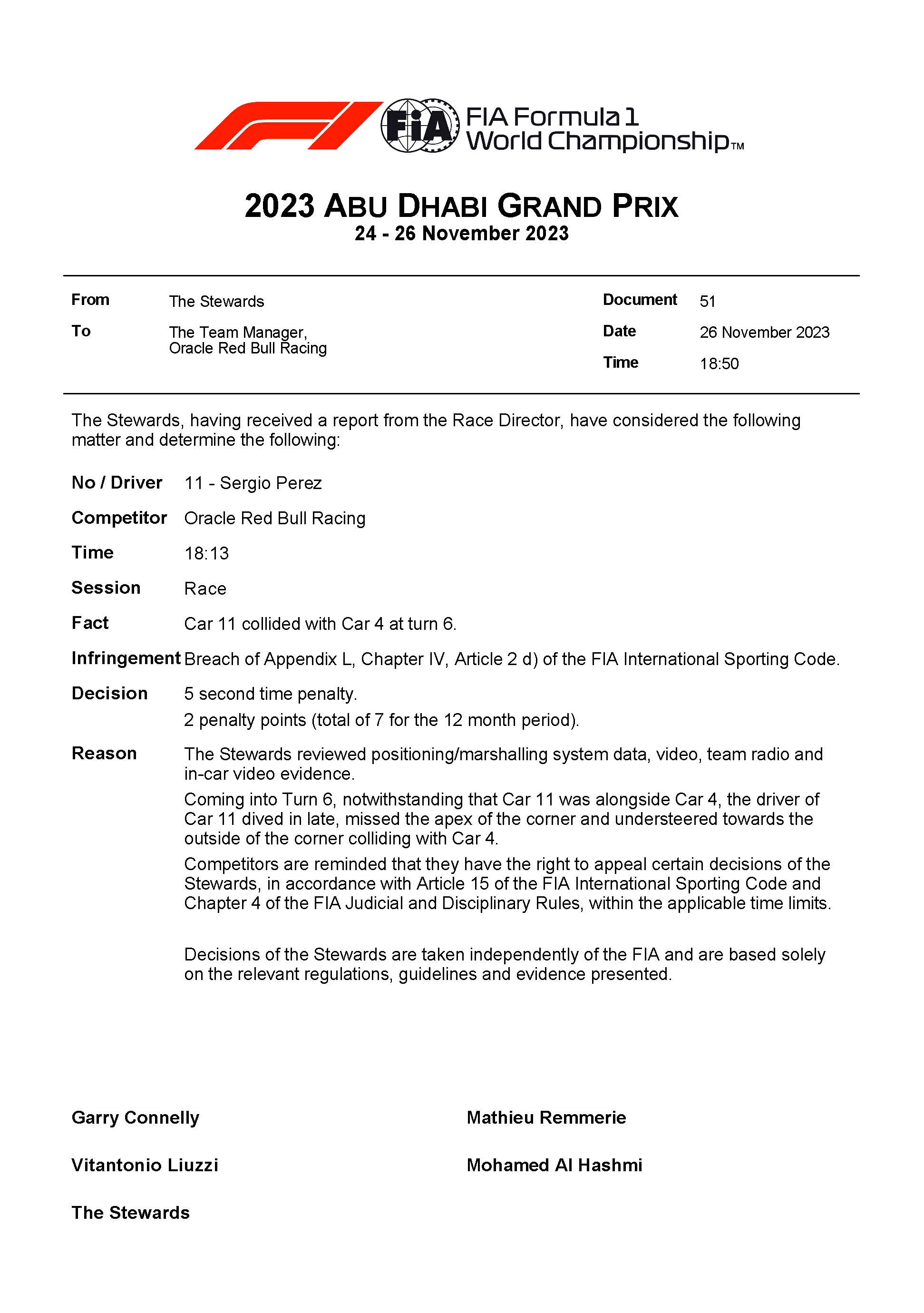 Les explications des commissaires concernant la pénalité de cinq secondes infligée à Pérez dans la collision qu'il a eu avec Norris : "En abordant le virage 6, bien que la voiture n°11 [Pérez] était à côté de la voiture n°4 [Norris], le pilote de la voiture n°11 a plongé tardivement, manqué l'apex du virage et a sous-viré vers l'extérieur du virage, entrant en collision avec la voiture n°4."