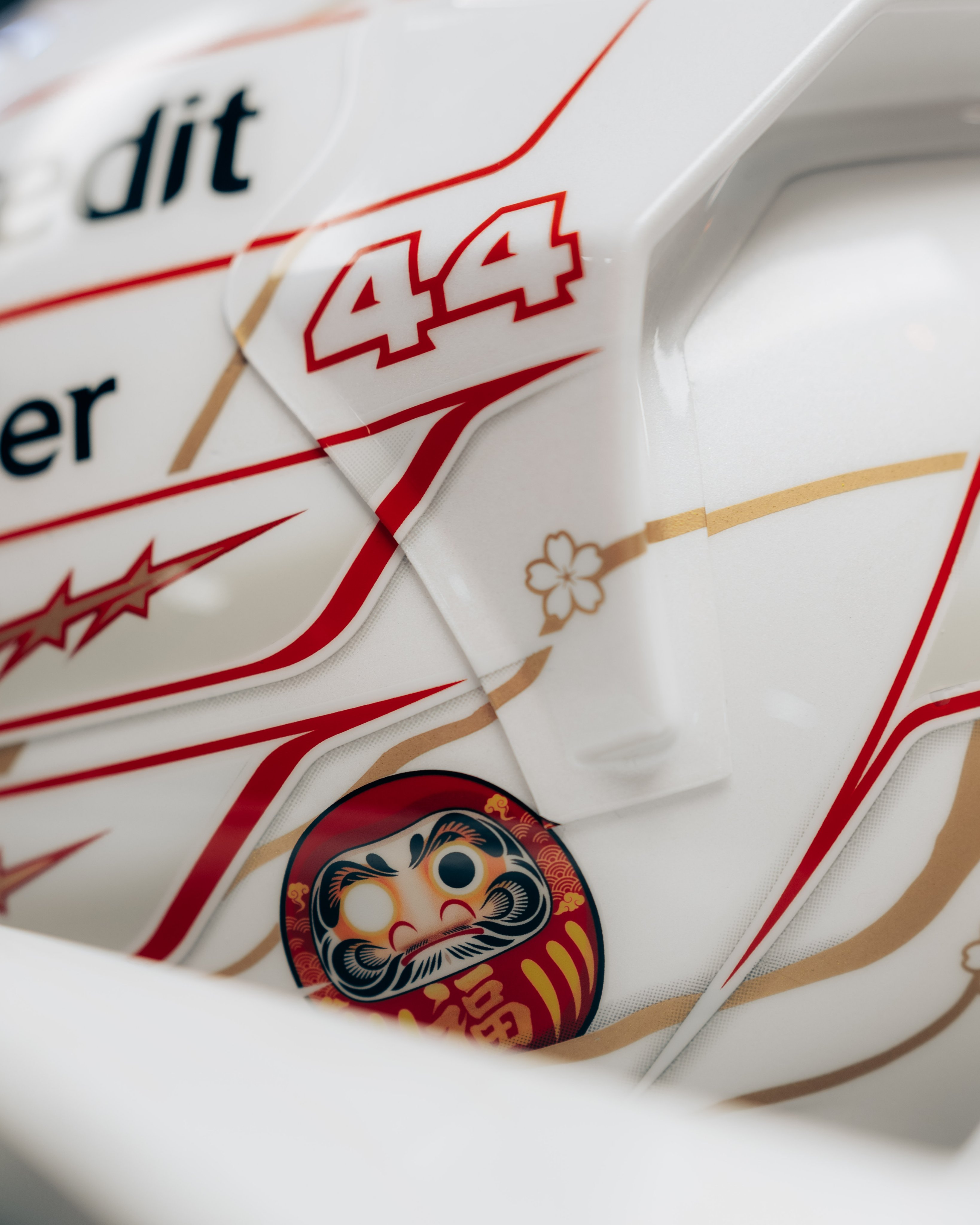À Suzuka, Lewis Hamilton arbore un casque spécial japonais, à base blanche plutôt que jaune.